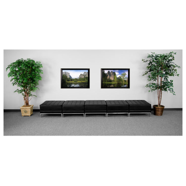 The Flash Furniture ZB-IMAG-OTTO-5-GG Hercules Imagination Series Bench is a versatile seating solution designed for diverse environments, measuring 140"W x 28"D x 17"H in overall dimensions. It includes five modular ottomans, each 28"W x 28"D x 17"H, allowing for customizable configurations to suit varying spatial needs. This bench features LeatherSoft upholstery, combining leather and polyurethane for added softness and durability, complemented by tufted upholstery that adds a touch of elegance. The fixed cushion design ensures stability and comfort, while the integrated stainless steel legs provide robust support and a modern aesthetic. The inclusion of CA117 fire retardant foam underscores its commitment to safety standards. Available in black, this bench requires assembly upon delivery, which is conveniently shipped in three boxes. Ideal for office spaces, waiting areas, or contemporary living rooms, the Hercules Imagination Series Bench is both functional and stylish. In-stock items typically ship within 24 hours, ensuring prompt delivery for time-sensitive projects. This bench, with its modular capability and sophisticated design, offers an adaptable solution for various market segments, from corporate to residential settings, making it a practical and appealing choice for those seeking both utility and modern design.