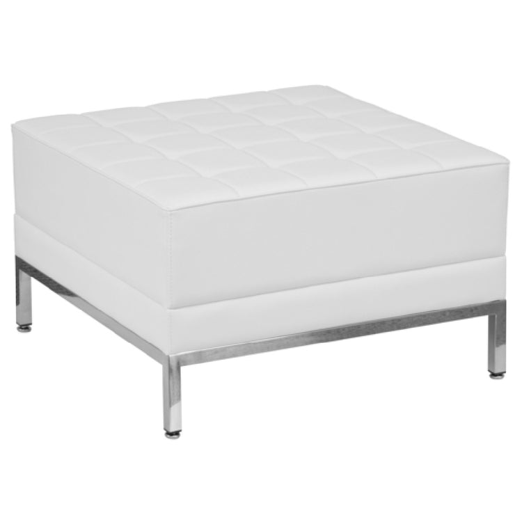 The Flash Furniture ZB-IMAG-OTTOMAN-WH-GG Hercules Imagination Series Ottoman 28"W X 28"D X 17"H is a versatile and stylish piece designed for modern living spaces and commercial environments. This ottoman features a modular design, allowing it to be integrated seamlessly into various configurations to suit different room layouts. With its LeatherSoft upholstery, a blend of leather and polyurethane, it offers a supple feel and enhanced durability, perfect for high-traffic areas. The tufted upholstery adds an element of sophistication and visual interest, while the CA117 fire retardant foam ensures compliance with fire safety standards, making it suitable for commercial applications like lobbies and waiting areas. The integrated stainless steel legs provide robust support and a contemporary aesthetic, complementing the sleek white finish. Measuring 28 inches in width and depth, and standing 17 inches tall, this ottoman is compact yet substantial, fitting effortlessly into diverse settings. Assembly is required, and in-stock items typically ship within 24 hours, highlighting its accessibility for prompt furnishing needs. This ottoman is an ideal choice for those seeking a combination of functionality, safety, and modern design in residential or commercial interiors.
