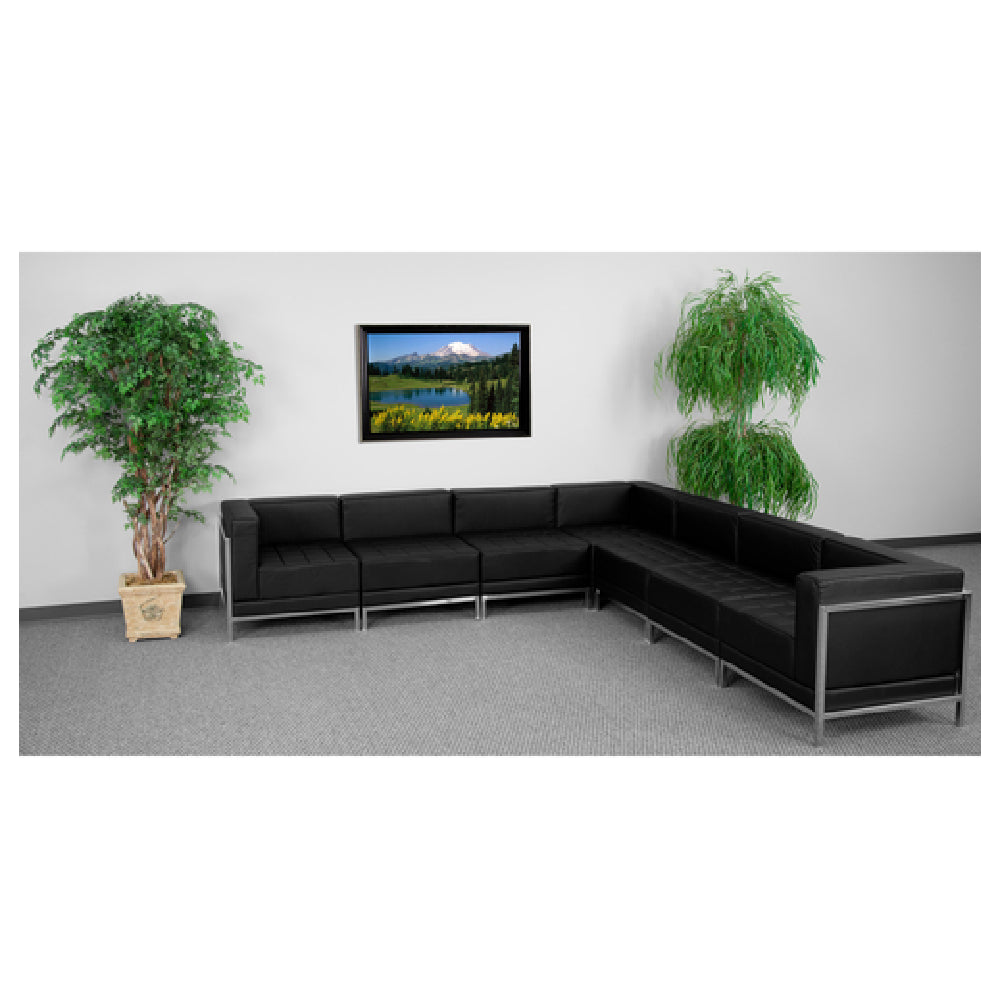 The Flash Furniture ZB-IMAG-SECT-SET1-GG Hercules Imagination Series Sectional is a versatile, modular seating solution designed to meet diverse market needs with precision and style. Measuring 113"W x 28-3/4" to 113"D x 27-1/2"H overall, this 7-piece sectional comprises four 28"W x 28-3/4"D x 27-1/4"H middle chairs, two 28-1/2"W x 28-1/2"D x 27-1/2"H left corner chairs, and one 28-1/2"W x 28-1/2"D x 27-1/2"H right corner chair. The straight arm design, combined with a smooth back and tufted seat, offers a sophisticated aesthetic. Fixed seat and back cushions ensure consistent comfort, while CA117 fire retardant foam enhances safety. The sectional's sleek look is completed with an exposed stainless steel accent bar and robust stainless steel legs. Upholstered in black LeatherSoft, it balances durability with luxurious softness. Assembly is required, and the product is conveniently shipped in seven boxes, with in-stock items typically dispatched within 24 hours. The Flash Furniture ZB-IMAG-SECT-SET1-GG sectional is ideal for businesses seeking adaptable seating solutions in hospitality, corporate, and residential settings, providing a unique blend of functionality and contemporary design.