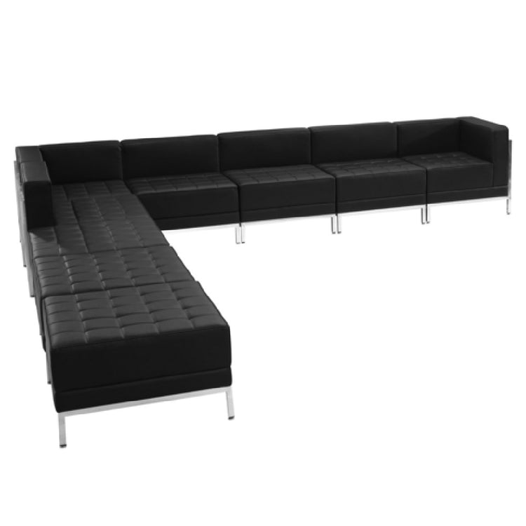 The Flash Furniture ZB-IMAG-SECT-SET11-GG Hercules Imagination Series Sectional is a versatile and customizable seating solution ideal for various environments, including corporate office spaces, hospitality areas, and contemporary homes. This modular 9-piece sectional features a generous overall dimension of 141"W x 28-3/4" to 140-1/2"D x 27-1/2"H, making it suitable for both expansive and compact spaces. It includes four 28"W x 28-3/4"D x 27-1/4"H middle chairs, one 28-1/2"W x 28-1/2"D x 27-1/2"H left corner chair, one 28-1/2"W x 28-1/2"D x 27-1/2"H right corner chair, and three 28"W x 28"D x 17"H ottomans. The sectional's straight arm design, smooth back, and tufted seat add a touch of sophistication, while its fixed seat and back cushions provide stability and comfort. Constructed with CA117 fire retardant foam, it ensures safety and compliance with fire safety standards. The sectional is further enhanced with an exposed stainless steel accent bar and stainless steel legs, complementing its black LeatherSoft upholstery. This product requires assembly and is conveniently shipped in nine boxes, with in-stock items typically shipping within 24 hours, ensuring prompt delivery.