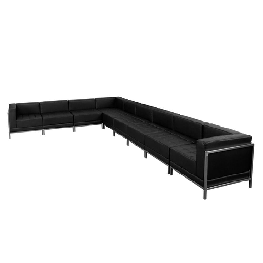 The Flash Furniture ZB-IMAG-SECT-SET3-GG Hercules Imagination Series Sectional Extended Right Side is a versatile and robust 9-piece modular seating solution designed to meet the varied demands of modern spaces. Measuring 169"W x 28-3/4" to 113"D x 27-1/2"H overall, this sectional provides ample seating configuration options. It includes six middle chairs, each 28"W x 28-3/4"D x 27-1/4"H, two left corner chairs, and one right corner chair, both corner chairs measuring 28-1/2"W x 28-1/2"D x 27-1/2"H. The sectional features a straight arm design, smooth back, and tufted seat, with fixed seat and back cushions for added comfort. Engineered for durability, it includes CA117 fire retardant foam, adding safety and resilience to its design. Exposed stainless steel accent bars and legs complement its modern aesthetic, while the black LeatherSoft upholstery offers a sophisticated appearance. Shipped in nine boxes and usually dispatched within 24 hours, this sectional is ideal for commercial environments such as hotels, lounges, and offices, where flexibility and style are essential. Assembly is required, supporting customization and adaptability in varied settings.