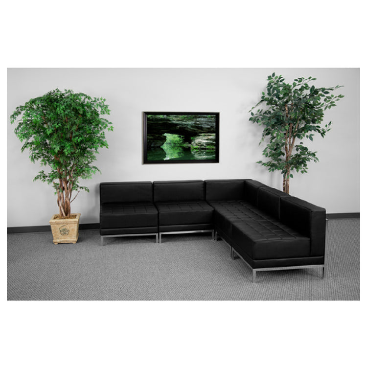 The Flash Furniture ZB-IMAG-SECT-SET5-GG Hercules Imagination Series Sectional is a versatile and modular seating solution designed to meet the needs of various market segments. This 5-piece sectional measures 84-1/2" wide and ranges from 28-3/4" to 84-1/2" in depth, with an overall height of 27-1/2". It includes four middle chairs, each measuring 28" wide by 28-3/4" deep by 27-1/4" high, and one right corner chair, with dimensions of 28-1/2" wide by 28-1/2" deep by 27-1/2" high. The sectional features a straight arm design and a smooth back with tufted seats, providing a modern aesthetic. The fixed seat and back cushions are crafted with CA117 fire retardant foam, ensuring safety and comfort. This product is accentuated with an exposed stainless steel accent bar and sturdy stainless steel legs, enhancing its durability and style. Upholstered in black LeatherSoft, the sectional requires assembly and is shipped in five boxes. Notably, in-stock items typically ship within 24 hours, making it a quick and efficient choice for commercial spaces looking to enhance their seating arrangements with a durable and stylish furniture piece.