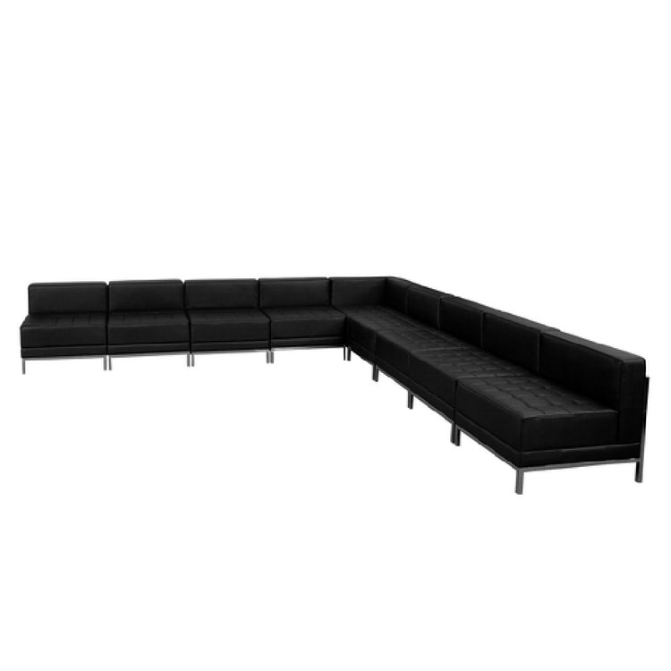 The Flash Furniture ZB-IMAG-SECT-SET7-GG Hercules Imagination Series Sectional is a versatile and robust sectional designed to meet the diverse needs of modern interior spaces. This 9-piece modular set measures 140-1/2"W x 28-3/4" to 140-1/2"D x 27-1/2"H overall, making it adaptable for various layouts and room sizes. The set includes eight middle chairs, each measuring 28"W x 28-3/4"D x 27-1/4"H, and one right corner chair at 28-1/2"W x 28-1/2"D x 27-1/2"H. Crafted with a straight arm design, it features a smooth back and tufted seat for a sleek and modern aesthetic. The fixed seat and back cushions are made with CA117 fire retardant foam, ensuring safety and durability. Its exposed stainless steel accent bar and legs add a touch of elegance while providing sturdy support. The sectional is upholstered in black LeatherSoft, combining leather and polyurethane for added softness and durability. Assembly is required, and the product ships in nine boxes, with in-stock items typically shipping within 24 hours. This sectional is ideal for businesses and homes looking for a customizable and stylish seating solution.