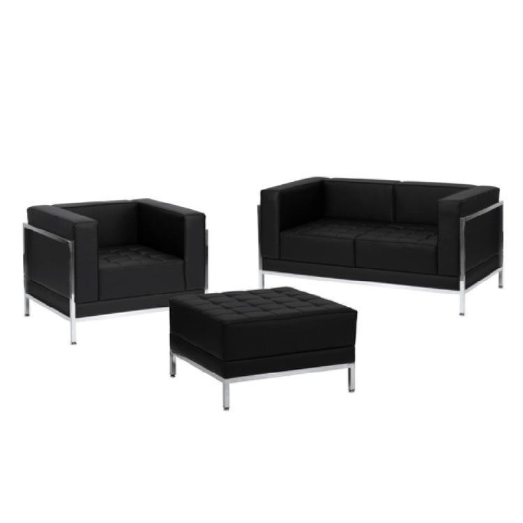 The Flash Furniture ZB-IMAG-SET11-GG HERCULES Imagination Series Black LeatherSoft Loveseat is a sophisticated seating solution designed to cater to various environments with its sleek and modern appeal. Constructed as part of a versatile set, this loveseat includes a chair and ottoman, providing a cohesive and luxurious seating arrangement. The loveseat features LeatherSoft upholstery, a blend of leather and polyurethane, offering the softness and durability required for high-traffic areas. This elegant piece is part of the HERCULES Imagination Series, known for its robust build quality and contemporary design aesthetics, making it suitable for both commercial settings like office lobbies, waiting areas, and private homes seeking a touch of luxury. The Black LeatherSoft material not only enhances the loveseat's visual appeal but also ensures easy maintenance and longevity, catering to the needs of industries requiring durable furniture solutions. With a focus on ergonomic comfort and aesthetic versatility, the Flash Furniture ZB-IMAG-SET11-GG loveseat is an exemplary choice for those who value style and functionality in their seating options, providing a unique value proposition for diverse market segments within the furniture industry.