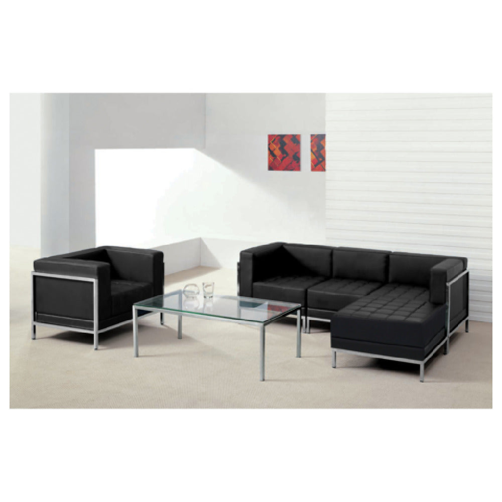 Flash Furniture ZB-IMAG-SET12-GG HERCULES Imagination Series Black LeatherSoft Sectional & Chair is a sophisticated ensemble designed for versatile use across various market segments, including office spaces, lounges, and upscale residential settings. This 5-piece set is crafted with LeatherSoft, a blend of leather and polyurethane, providing both softness and durability, making it an appealing choice for environments that demand both comfort and resilience. The modular design of the sectional allows for flexible arrangement to suit different spatial configurations, enhancing its functionality in dynamic settings. Each piece is designed with an emphasis on sturdiness and elegance, offering a black color scheme that seamlessly integrates into various decors. The HERCULES Imagination Series stands out for its commercial-grade construction, ensuring long-lasting performance in high-traffic areas. This specific model, identified as ZB-IMAG-SET12-GG, embodies a perfect balance of style, comfort, and practicality, catering to the needs of businesses looking to create welcoming yet professional atmospheres. Its contemporary design, combined with quality materials, positions it as a valuable asset for those seeking to elevate their interior spaces with a touch of modern sophistication.