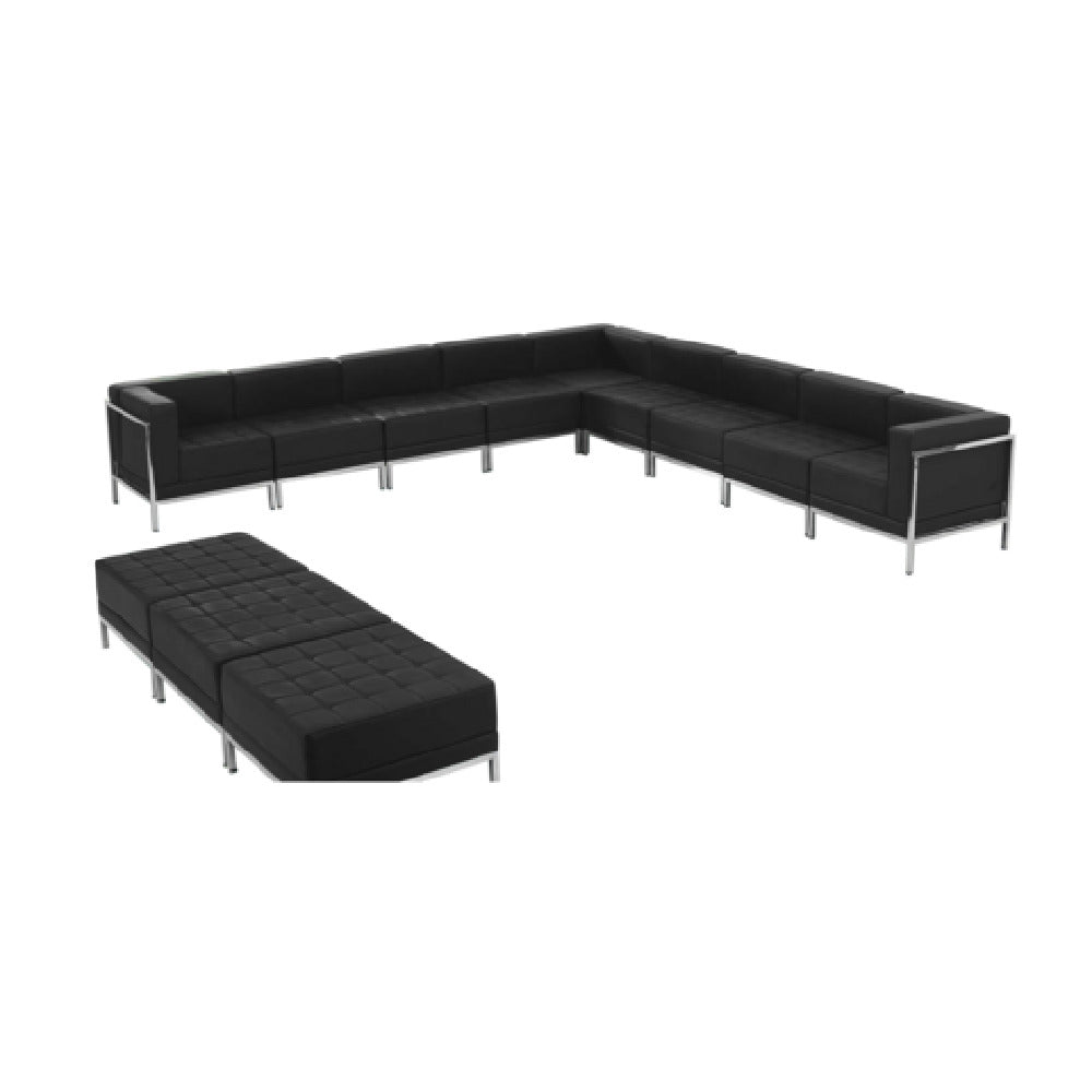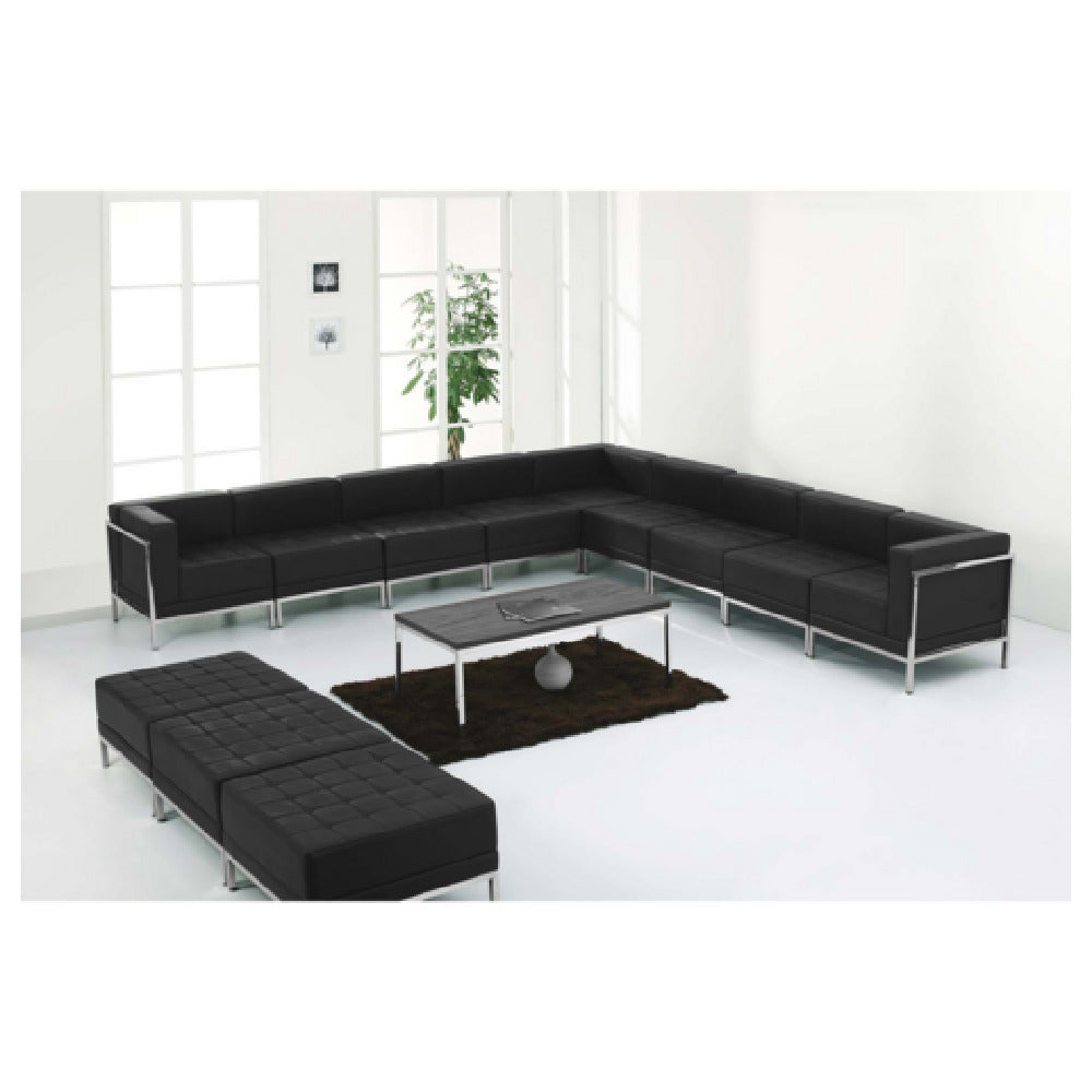 Flash Furniture ZB-IMAG-SET18-GG Hercules Imagination Series Sectional & Ottoman Set is a versatile 12-piece modular seating solution, perfect for modern spaces requiring flexibility and style. This set includes six middle chairs measuring 28"W x 28-3/4"D x 27-1/4"H, two left corner chairs and one right corner chair, both 28-1/2"W x 28-1/2"D x 27-1/2"H, and three ottomans 28"W x 28"D x 17"H. It features a sleek straight arm design, complemented by a smooth back and tufted seat for added comfort. The fixed seat and back cushions are constructed with CA117 fire retardant foam, ensuring safety and durability in high-traffic areas. The exposed stainless steel accent bar and legs add a modern touch to the black LeatherSoft upholstery, blending elegance with practicality. Ideal for office lounges, hotel lobbies, or contemporary homes, this sectional set offers a sophisticated solution for various environments. Designed for easy assembly and shipped in 12 boxes, it ensures quick setup, with in-stock items typically shipping within 24 hours. The Flash Furniture Hercules Imagination Series is a standout choice for those seeking a blend of functionality, safety, and modern design in their seating arrangements.
