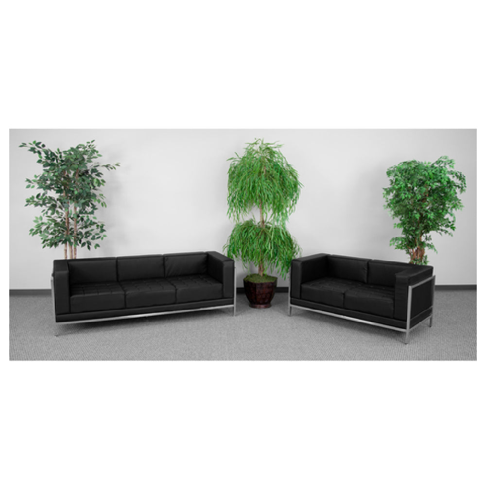 The Flash Furniture ZB-IMAG-SET2-GG Hercules Imagination Series Sofa & Loveseat Set is a modular furniture collection designed for versatility and comfort in various settings. This set includes one loveseat measuring 57 inches in width, 28.75 inches in depth, and 27.25 inches in height, along with a sofa that is 79 inches wide. Both pieces feature LeatherSoft upholstery, blending leather and polyurethane for added softness and durability. The design includes a straight arm style, a smooth back, and a tufted seat, with fixed seat and back cushions to ensure comfort and stability. The set is constructed with CA117 fire retardant foam, adding a layer of safety for users. An exposed stainless steel accent bar and integrated stainless steel legs provide a sleek, modern look. These features make this sofa and loveseat set an ideal choice for office spaces, waiting areas, and modern living rooms seeking a blend of style and functionality. Assembly is required, and the set is shipped in two boxes, typically within 24 hours for in-stock items, ensuring a quick and convenient setup process.