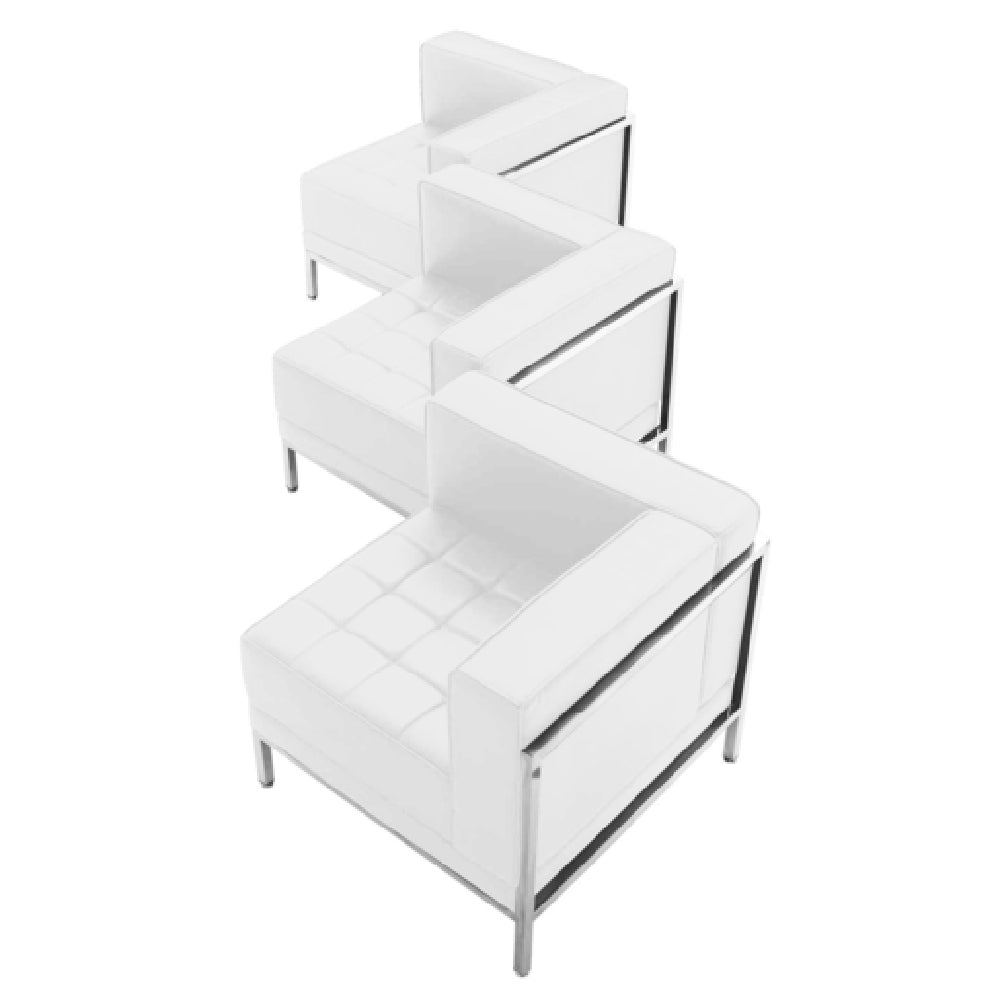 The Flash Furniture ZB-IMAG-SET4-WH-GG Hercules Imagination Series Corner Chair Set features a versatile and robust design, perfect for contemporary office spaces and stylish waiting areas. Comprising three left corner chairs, each measuring 28-1/2 inches wide by 28-1/2 inches deep by 27-1/2 inches high, this set allows for modular configurations that adapt to varied space requirements. Upholstered with LeatherSoft, a blend of leather and polyurethane, it delivers both comfort and durability. The design showcases a straight arm layout accompanied by a smooth back and tufted seat, providing a sophisticated aesthetic. Fixed seat and back cushions ensure stability and uniformity, while the inclusion of CA117 fire retardant foam underscores a commitment to safety standards. Highlighted by an exposed stainless steel accent bar and integrated stainless steel legs, the set offers a sleek and modern look. The chair set is presented in a classic white finish, requiring assembly upon arrival. Shipped in three boxes for convenience, in-stock items typically dispatch within 24 hours, streamlining the process for commercial furniture buyers. This product stands out for its durable materials and adaptable design, making it a reliable choice for environments where style and functionality are paramount.