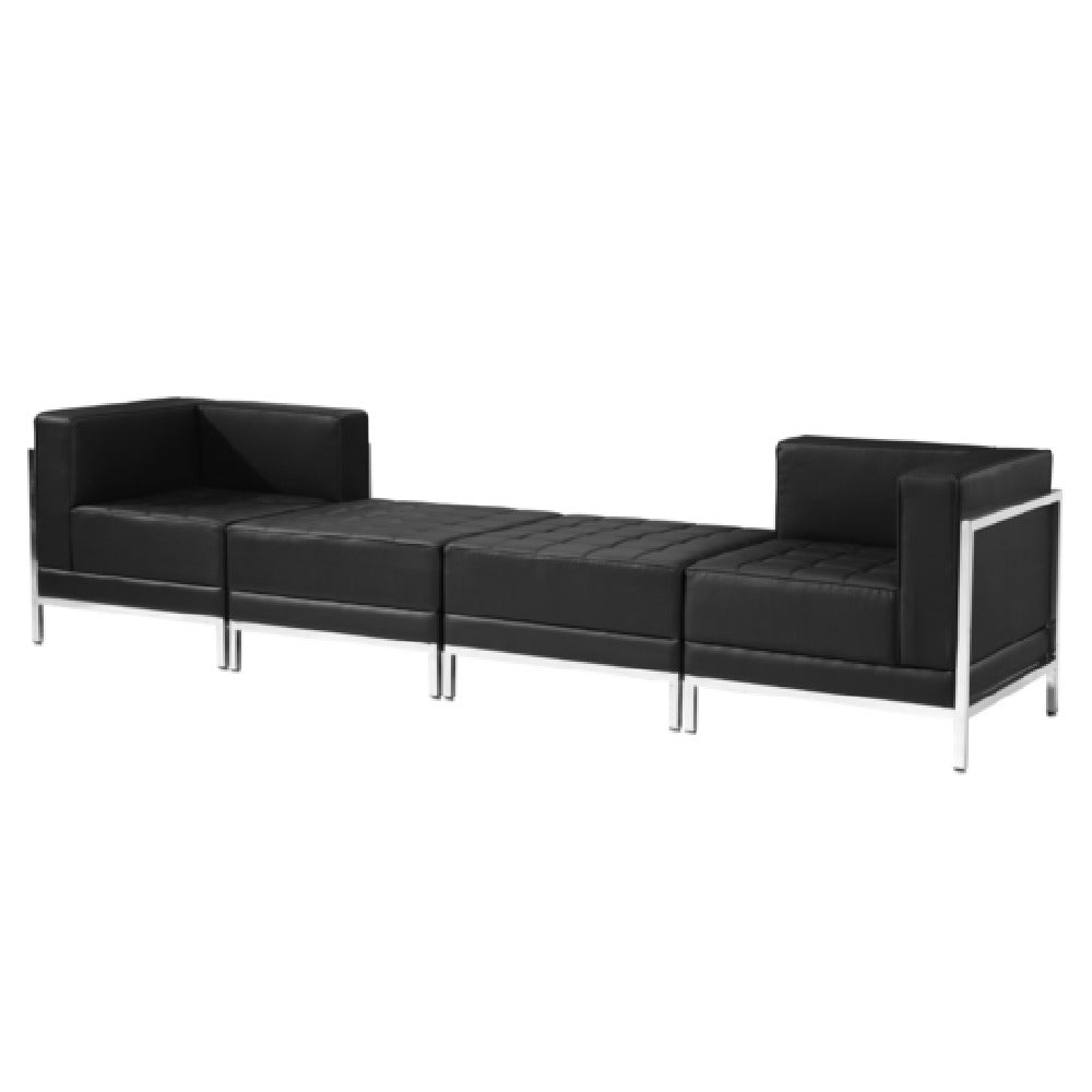 The Flash Furniture ZB-IMAG-SET7-GG Hercules Imagination Series Chair & Ottoman Set is a sophisticated and versatile furniture solution measuring 113"W x 28"D x 27-1/4"H in overall dimensions. It includes a left corner seat and a right corner seat, each measuring 28-1/2"W x 28-1/2"D x 27-1/2"H, along with two ottomans sized at 28"W x 28"D x 17"H. This modular set features LeatherSoft upholstery, combining leather and polyurethane for added softness and durability, alongside a straight arm design and a smooth, tufted seat. The fixed seat and back cushions are crafted with CA117 fire retardant foam for enhanced safety. Aesthetic appeal is heightened by an exposed stainless steel accent bar and integrated stainless steel legs. The set is available in a classic black color and requires assembly, shipping in four boxes. With items typically in stock shipping within 24 hours, this chair and ottoman set is ideal for various industry segments seeking reliable, stylish, and comfortable seating solutions.