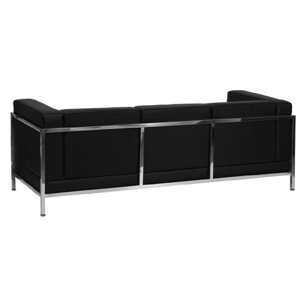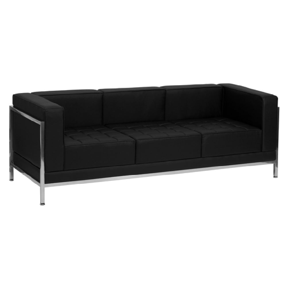 The Flash Furniture ZB-IMAG-SOFA-GG Hercules Imagination Series Sofa is meticulously crafted to fit various sophisticated environments with its generous dimensions of 79"W x 28-3/4"D x 27-1/4"H. Designed with precision, this sofa boasts LeatherSoft upholstery, combining leather and polyurethane for added softness and durability, making it a standout piece for offices, lounges, and waiting areas. Featuring a straight arm design, smooth back, and tufted seat, it presents a sleek and modern aesthetic. The fixed seat and back cushions provide consistent comfort and support, complemented by CA117 fire retardant foam, ensuring safety and peace of mind in busy public spaces. The exposed stainless steel accent bar and integrated stainless steel legs not only enhance the sofa's contemporary appeal but also provide structural integrity. Available in classic black, this piece requires assembly yet promises a quick setup, with in-stock items typically shipping within 24 hours. Its robust construction and elegant design make the Flash Furniture ZB-IMAG-SOFA-GG an ideal choice for diverse market segments seeking reliable, stylish seating solutions.