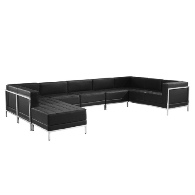 The Flash Furniture ZB-IMAG-U-SECT-SET4-GG Hercules Imagination Series Sectional is a versatile modular seating solution designed to meet the needs of modern spaces. Measuring an overall 141-1/4"W x 79" to 84-1/2"D x 27-1/4"H, this sectional's U-shape design includes four middle chairs at 28"W x 28-3/4"D x 27-1/4"H each, a right corner chair at 28-1/2"W x 28-1/2"D x 27-1/2"H, a sofa at 79"W x 28-3/4"D x 27-1/4"H, and an ottoman at 28"W x 28"D x 17"H. This configuration is ideal for corporate lounges, reception areas, or residential spaces seeking a blend of comfort and style. The sectional features a smooth back with tufted seat cushions, and fixed seat and back cushions that are upholstered in black LeatherSoft, a blend of leather and polyurethane for added softness and durability. CA117 fire retardant foam ensures safety, while the exposed stainless steel accent bar and legs provide a sleek, modern aesthetic. The sectional requires assembly and ships in seven boxes, typically within 24 hours for in-stock items, making it a practical choice for those seeking quick setup and immediate use.