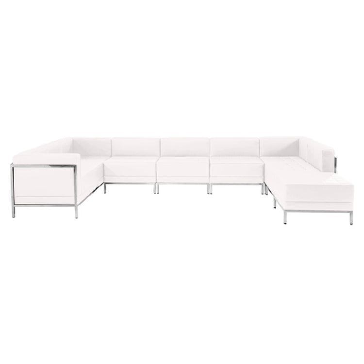 The Flash Furniture ZB-IMAG-U-SECT-SET4-WH-GG Hercules Imagination Series Sectional is a sophisticated, modular seating solution perfect for contemporary spaces. Its U-shape design spans 141-1/4 inches in width and ranges from 79 to 84-1/2 inches in depth, with a height of 27-1/4 inches. This sectional set includes four middle chairs, each measuring 28 inches wide by 28-3/4 inches deep and 27-1/4 inches high, and a right corner chair with dimensions of 28-1/2 inches wide by 28-1/2 inches deep and 27-1/2 inches high. Additionally, the sectional features a spacious sofa measuring 79 inches wide by 28-3/4 inches deep by 27-1/4 inches high, complemented by a 28-inch wide by 28-inch deep by 17-inch high ottoman. The sophisticated straight arm design combines with a smooth back and tufted seat, offering both comfort and style. The fixed seat and back cushions are constructed with CA117 fire retardant foam for enhanced safety. Elegantly finished with an exposed stainless steel accent bar and legs, the sectional is upholstered in white LeatherSoft. Assembly is required, and the product ships in seven boxes, typically dispatching within 24 hours when in stock. This sectional caters to diverse market segments, providing a chic and functional seating arrangement.