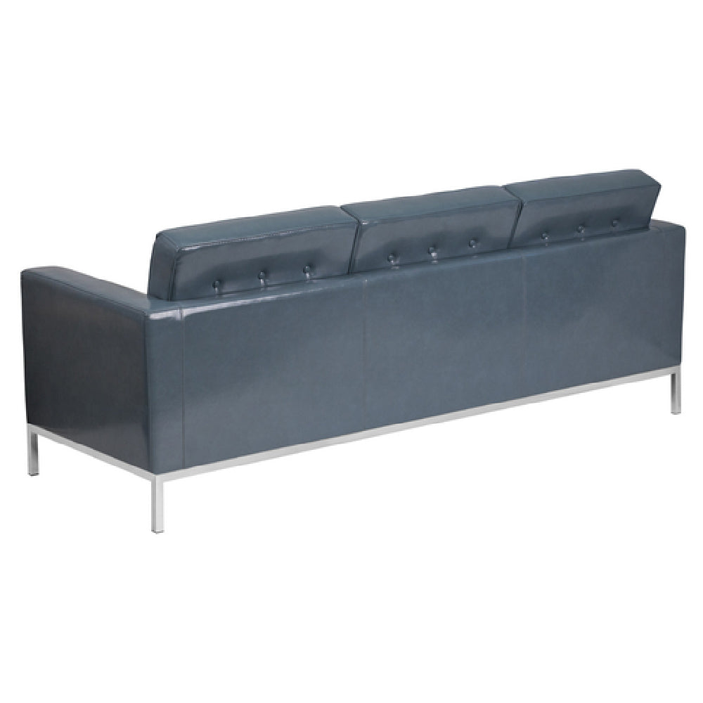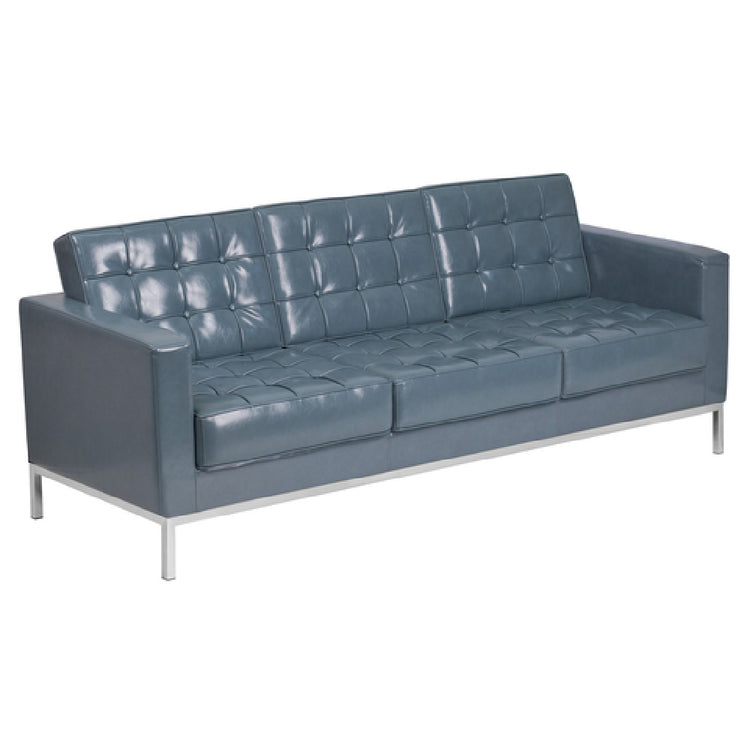 The Flash Furniture ZB-LACEY-831-2-SOFA-GY-GG Hercules Lacey Series Sofa is a sophisticated seating option measuring 80"W x 31"D x 32"H, ideal for both residential and commercial spaces seeking a blend of style and durability. This sofa is upholstered in LeatherSoft, a combination of leather and polyurethane, offering enhanced softness and longevity. The design features a button-tufted seat and back, providing an elegant aesthetic while ensuring superior comfort. Its fixed seat and back cushions are crafted using CA117 fire retardant foam, ensuring safety without compromising on comfort. The sofa is accentuated by an integrated stainless steel frame and legs, contributing to its modern appeal and structural stability. The gray color adds a neutral tone, making it versatile enough to complement various interior decors. Assembly is required, yet the straightforward design facilitates an easy setup process. For businesses and homeowners alike, this sofa serves as a reliable and stylish addition, providing comfortable seating backed by durable construction. Moreover, in-stock items usually ship within 24 hours, offering prompt availability for those in need of quick furnishing solutions.