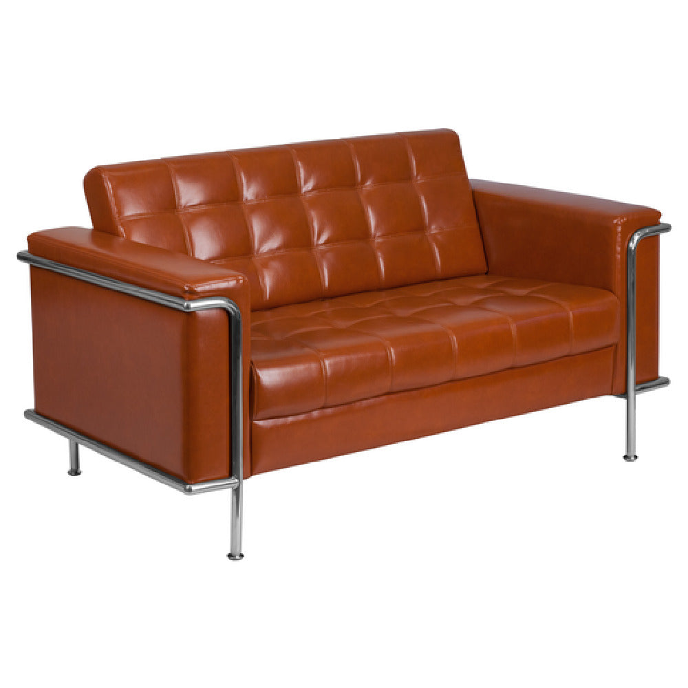 The Flash Furniture ZB-LESLEY-8090-LS-COG-GG Hercules Lesley Series Loveseat is a meticulously designed seating solution that integrates both style and comfort for various market segments. Measuring 59 inches in width, 33 inches in depth, and 32-1/4 inches in height, this loveseat is an optimal fit for compact spaces while maintaining a spacious seating area. Its LeatherSoft upholstery combines genuine leather and polyurethane, providing enhanced softness and durability. The loveseat features a tufted seat and back, offering a classic aesthetic with modern comfort. Fixed seat and back cushions ensure a neat and tidy appearance, while CA117 fire retardant foam adds a layer of safety. The exposed stainless steel accent bar and integrated stainless steel legs contribute to its contemporary design, ensuring stability and a touch of elegance. Available in a cognac color, this loveseat requires assembly upon delivery. Typically, in-stock items ship within 24 hours, making it a convenient choice for businesses needing prompt furniture solutions. The Flash Furniture Hercules Lesley Series Loveseat is ideal for office lounges, waiting areas, and residential settings, where it provides a stylish and reliable seating option.