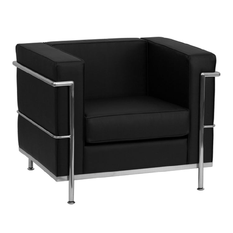 The Flash Furniture ZB-REGAL-810-1-CHAIR-BK-GG Hercules Regal Series Chair LeatherSoft Upholstery is a sophisticated seating solution engineered to meet the demands of various market segments, from commercial office spaces to luxury home environments. The chair features a sleek straight arm design complemented by its taut seat and back, ensuring optimal support and comfort. Its removable seat cushion adds versatility and ease of maintenance, allowing users to customize their seating experience. Constructed with CA117 fire retardant foam, this chair prioritizes safety without compromising on comfort. An exposed stainless steel accent bar enhances the chair's modern aesthetic, while integrated stainless steel legs provide robust stability and durability. The LeatherSoft upholstery combines leather and polyurethane, delivering a soft-to-the-touch experience while being easy to clean and maintain. Available in black, this chair is a versatile addition to any decor. Notably, assembly is required, and in-stock items typically ship within 24 hours, ensuring prompt delivery to meet business or personal scheduling needs. This chair embodies a blend of style, function, and safety, making it a standout choice for those seeking quality and elegance in seating solutions.