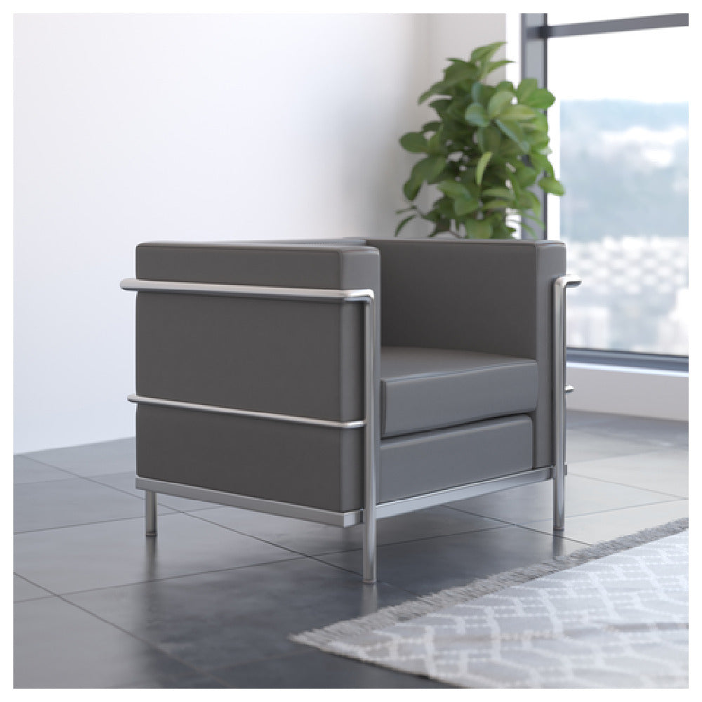 The Flash Furniture ZB-REGAL-810-1-CHAIR-GY-GG Hercules Regal Series Chair is a sophisticated seating option designed with a blend of style and functionality. Featuring LeatherSoft upholstery, this chair combines the durability and softness of leather with polyurethane, ensuring a comfortable and enduring user experience. The straight arm design and taut seat and back create a sleek, modern aesthetic that complements various interior decors. A key feature is the removable seat cushion, allowing for easy maintenance and prolonged product life. Safety is prioritized with the inclusion of CA117 fire retardant foam, providing an added layer of protection. The chair is enhanced by an exposed stainless steel accent bar and integrated stainless steel legs, offering both strength and an elegant finish. Available in gray, this chair requires assembly, but its design ensures that it can be shipped quickly, with in-stock items typically dispatched within 24 hours. This chair is suitable for diverse markets, including office settings, waiting areas, and home offices, providing a value proposition that combines style, comfort, and safety.