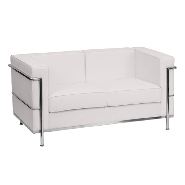 The Flash Furniture ZB-REGAL-810-2-LS-WH-GG Hercules Regal Series Loveseat stands out with its LeatherSoft upholstery, a unique blend of leather and polyurethane, providing both comfort and durability. With dimensions of 57"W x 28-1/2"D x 27-1/2"H, this loveseat is well-suited for a variety of spaces, from modern offices to stylish waiting areas. The straight arm design and taut seat and back offer a sleek and contemporary aesthetic, appealing to minimalist and modern décor styles. Notable features include removable seat cushions, allowing for easy maintenance and customization. Prioritizing safety, the loveseat is equipped with CA117 fire retardant foam, ensuring compliance with safety regulations. The loveseat's exposed stainless steel accent bar and integrated stainless steel legs add a touch of sophistication, enhancing its visual appeal and structural integrity. Available in white, this piece requires assembly but typically ships within 24 hours for in-stock items, supporting quick and efficient fulfillment for businesses. Its versatile design and robust construction make the Hercules Regal Series Loveseat an excellent choice for commercial settings, providing both style and functionality to corporate lounges, hotel lobbies, and upscale residential environments.