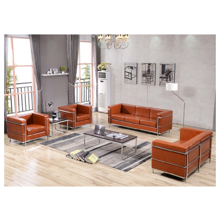 The Flash Furniture ZB-REGAL-810-SET-COG-GG Hercules Regal Series Reception Set is a sophisticated and functional addition to any reception area. This set includes a chair measuring 35 inches in width, 28.5 inches in depth, and 27.5 inches in height, alongside a loveseat and a sofa, designed to accommodate various seating needs. Each piece is upholstered in LeatherSoft, a combination of leather and polyurethane, offering enhanced durability and a softer feel. The set features a straight arm design and taut seat and back, with removable seat cushions for added convenience. Safety is prioritized with CA117 fire retardant foam, ensuring compliance with fire safety standards. The exposed stainless steel accent bar and integrated stainless steel legs add a modern and sleek aesthetic to the design. The rich cognac color enhances its elegance, making it suitable for diverse professional environments. Assembly is required, and the set is shipped in three separate boxes. In-stock items typically ship within 24 hours, ensuring prompt delivery. This reception set is ideal for businesses seeking a blend of style, comfort, and safety in their furniture, making it a valuable asset in creating a welcoming atmosphere for clients and visitors.