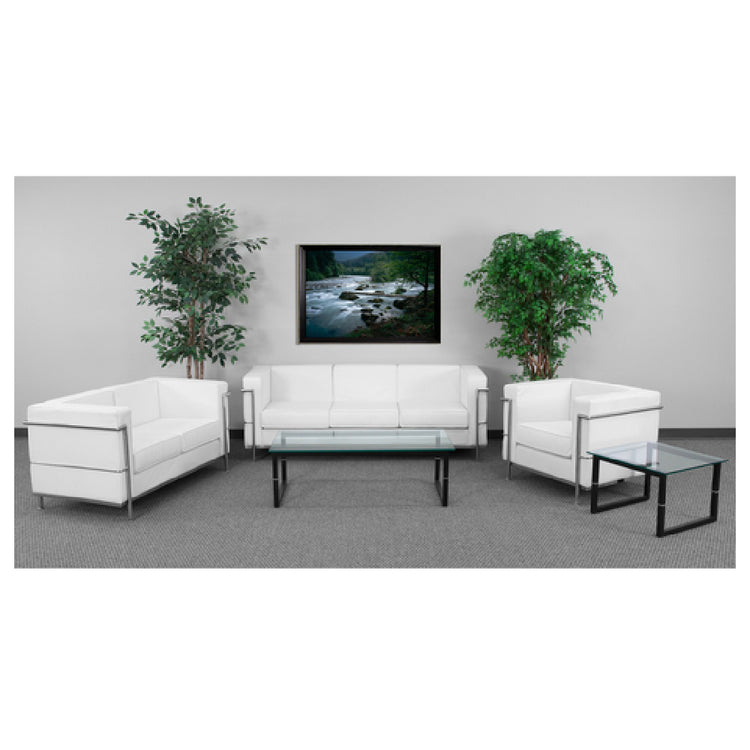 The Flash Furniture ZB-REGAL-810-SET-WH-GG Hercules Regal Series Reception Set is a comprehensive seating solution designed for versatility and sophistication in reception areas. This set includes a 35"W x 28-1/2"D x 27-1/2"H chair, a 57"W x 28-1/2"D x 27-1/2"H loveseat, and a 79"W x 28-1/2"D x 27-1/2"H sofa, all upholstered in LeatherSoft for a soft and durable finish. The design features a straight arm construction and taut seat and back for a clean, modern aesthetic. Each seating piece comes with removable seat cushions filled with CA117 fire retardant foam, ensuring safety and comfort. The set is accentuated with an exposed stainless steel bar and integrated stainless steel legs, adding a touch of elegance and robustness. This reception set is available in a pristine white color, contributing to a bright and inviting atmosphere. Assembly is required, and the components are shipped in three boxes. Ideal for businesses seeking to create an inviting and professional reception area, this set offers practicality with quick shipping, as in-stock items usually dispatch within 24 hours, making it a smart choice for both functionality and style.
