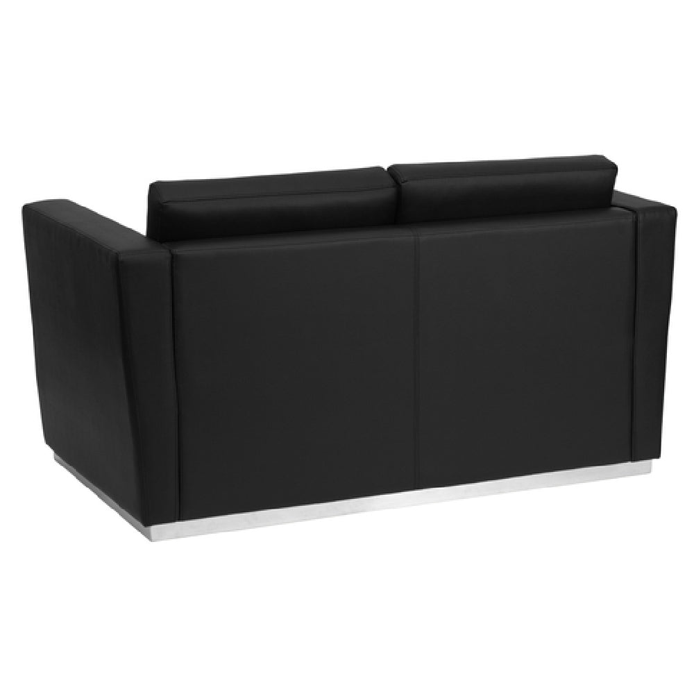 The Flash Furniture ZB-TRINITY-8094-LS-BK-GG Hercules Trinity Series Loveseat, measuring 55-1/2"W x 32"D x 31"H, is a versatile seating solution that combines both style and function, making it suitable for various environments such as offices, waiting rooms, or residential spaces. This loveseat is upholstered in LeatherSoft, a blend of leather and polyurethane, offering a soft yet durable seating surface. The straight arm design and taut seat and back provide a modern aesthetic, while the fixed seat and back cushions ensure consistent comfort. Line stitching throughout the piece adds a touch of sophistication. Safety is prioritized with CA117 fire retardant foam, meeting fire safety standards. The loveseat's integrated stainless steel legs not only contribute to a sleek look but also offer sturdy support. Available in black, this loveseat conveniently ships within 24 hours when in stock, catering to clients who require prompt delivery. The Flash Furniture Hercules Trinity Series Loveseat is engineered to provide comfort and elegance, making it an ideal choice for those who appreciate quality craftsmanship and contemporary design in a compact seating arrangement.