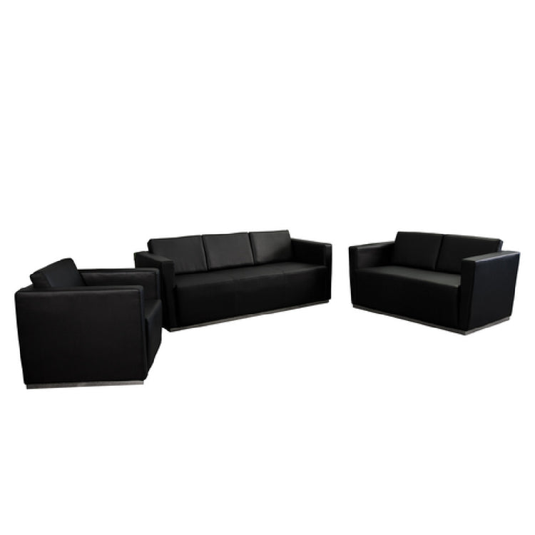 The Flash Furniture ZB-TRINITY-8094-SET-BK-GG Hercules Trinity Series Reception Set is an expertly crafted seating arrangement designed to enhance any reception area. This set includes a 33"W x 32"D x 31"H chair, a 55-1/2"W x 32"D x 31"H loveseat, and a 78-3/4"W x 32"D x 31"H sofa, all featuring LeatherSoft upholstery for a luxurious feel. Its straight arm design and taut seat and back create a sleek, modern aesthetic, complemented by fixed seat and back cushions and intricate line stitching throughout. The set is built to last, with each piece constructed using CA117 fire retardant foam for safety and a robust stainless steel base with a hollow center for stability. The rich black color ensures a timeless appeal in any setting. This versatile reception set is shipped in three boxes and requires assembly, making it a practical choice for various commercial spaces, from luxury hotels to corporate offices. In stock items typically ship within 24 hours, ensuring a quick addition to your professional environment.