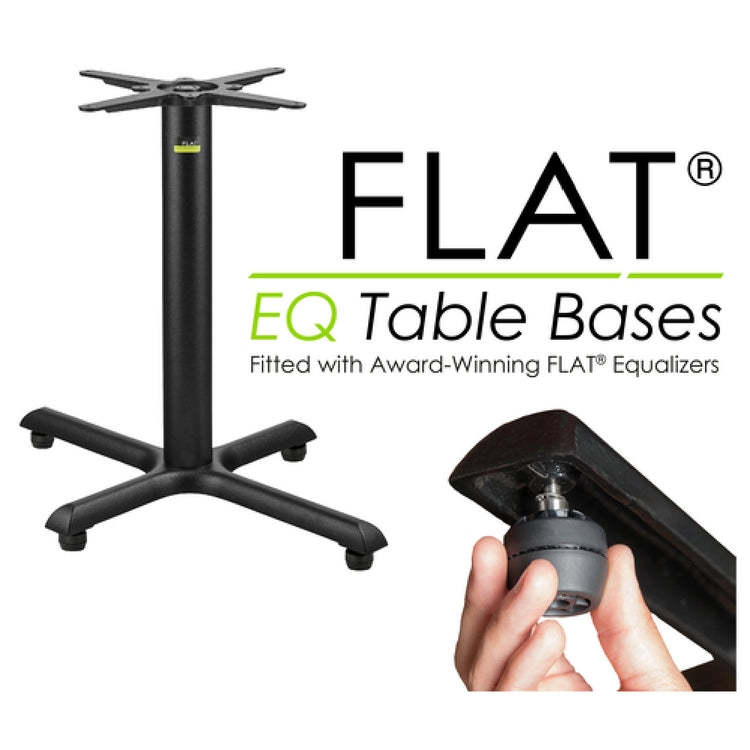 The FLAT Tech CT2062 KX2230 EQ Table Base Dining Height 22" X 30" Cross Base is a meticulously engineered product that stands out for its stability and durability in dining environments. This table base features a dining height with a cross base measuring 22 inches by 30 inches, ensuring a robust foundation for various tabletop sizes. The 3-inch diameter column and 13-inch by 13-inch mounting plate provide additional support and balance, critical for maintaining table stability in high-traffic areas. The inclusion of FLAT® Equalizers - stabilizing glides, coupled with hydraulic stabilization technology, sets this table base apart by automatically adjusting to uneven surfaces, thus preventing wobbling and enhancing user comfort. Constructed from cast iron with a textured finish, it promises longevity and resilience in demanding settings. It supports a maximum tabletop size of 30 inches by 36 inches rectangular, catering to a wide range of dining configurations and styles. This product, shipped in two boxes, is ideal for restaurants, cafes, and other dining establishments seeking reliable and innovative solutions for their furniture needs, ensuring a seamless dining experience for patrons while minimizing maintenance issues for operators.
