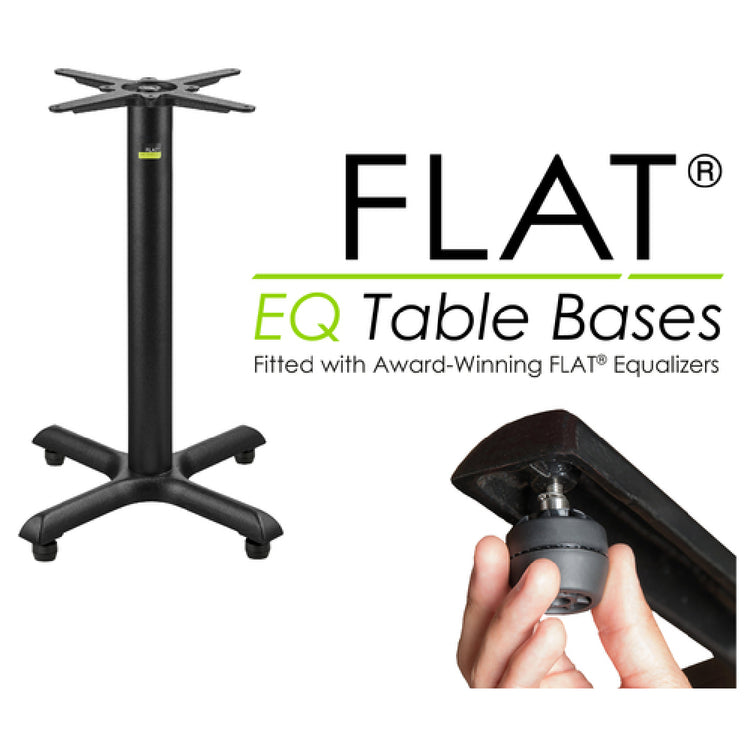 The FLAT Tech CT2063 KX22 EQ Table Base Dining Height 22" Cross Base is a meticulously designed piece that stands out for its innovative stabilization technology and robust construction, making it a valuable component for various dining environments. With a 22" cross base and a 3" diameter column, this table base provides a sturdy foundation suitable for supporting recommended top sizes of 30" round or square. Its 13" x 13" mounting plate ensures compatibility and ease of installation with a variety of tabletop configurations. A key feature of this table base is the integration of FLAT® Equalizers, which are stabilizing glides utilizing advanced hydraulic stabilization technology. This feature is particularly beneficial for ensuring balance and stability on uneven surfaces, enhancing the dining experience in both casual and formal settings. Constructed from durable cast iron and featuring a textured finish, this table base combines aesthetic appeal with practical functionality, making it an ideal choice for restaurants, cafes, and other dining establishments. The product is shipped in two boxes, reflecting its solid build and ease of assembly. The FLAT Tech CT2063 table base is a versatile solution for those seeking reliability and innovative stabilization in their dining furniture.