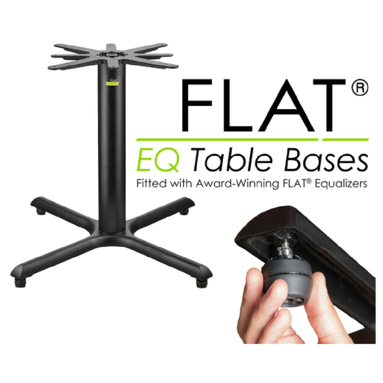 The FLAT Tech CT2068 KX36 EQ Table Base Dining Height 36" Cross Base is an industrial-grade table solution designed for stability and durability in various dining environments. Featuring a 36-inch cross base and a 4-inch diameter column, this table base is engineered to support large table tops, accommodating maximum sizes of 60 inches round and 47 inches square. The 17-inch by 17-inch mounting plate ensures a secure attachment to table tops, enhancing the overall stability of the dining setup. A key highlight of this product is the integration of FLAT® Equalizers - stabilizing glides, which employ advanced hydraulic stabilization technology to ensure a level surface on uneven floors. Constructed from heavy-duty cast iron, the CT2068 KX36 EQ Table Base is finished with a textured coating, providing both aesthetic appeal and resistance to wear and tear. This robust construction makes it suitable for high-traffic dining areas such as restaurants, cafes, and banquet halls, where durability and stability are critical. The table base ships in two boxes, facilitating easy handling and assembly. Ideal for commercial settings, this table base is a versatile and reliable choice for establishments seeking high performance and structural integrity in their dining furniture.
