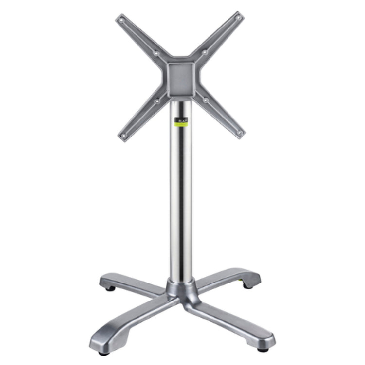 The FLAT Tech CT4330 SX26 Table Base Dining Height 26" Cross Base is a versatile and advanced solution designed for both indoor and outdoor dining environments. Featuring a 26-inch cross base and a 2-5/9 inch diameter column, this table base provides robust support and stability. The 15" x 15" flip top mounting plate allows for seamless and flexible tabletop integration, accommodating a maximum tabletop size of 32 inches square or round. The stackable design enhances storage efficiency, making it an excellent choice for spaces with fluctuating capacity needs. A notable feature is the hydraulic PAD stabilization technology, which ensures a steady dining experience even on uneven surfaces. Crafted from aluminum with a polished finish, this table base not only guarantees durability but also adds a sleek aesthetic appeal to any setting. Shipped in four boxes, the FLAT Tech CT4330 SX26 is engineered for ease of assembly and transport. Its combination of innovative technology and practical design makes it an ideal choice for restaurants, cafes, and hospitality venues seeking reliable and stylish table support solutions.
