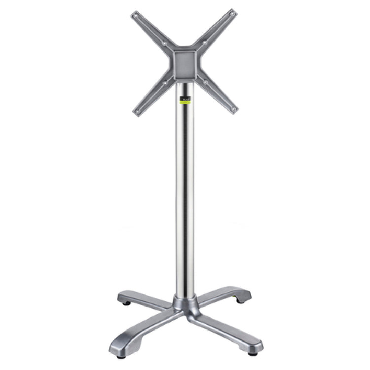 The FLAT Tech CT4333 SX26 Table Base Bar Height 26" Cross Base is a sophisticated and versatile solution for various dining settings, leveraging advanced engineering to deliver stability and style. This table base features a bar height of 26 inches and a robust cross base, ensuring a sturdy foundation for your tabletop. It includes a 2-5/9" diameter column and a 15" x 15" flip top mounting plate, allowing for a secure and flexible tabletop installation. Highlighting its adaptability, the table base supports a maximum tabletop size ranging from 26" square to 30" round, catering to diverse layout preferences. Designed for both indoor and outdoor use, it is stackable, optimizing storage efficiency when not in use. The incorporation of hydraulic PAD stabilization technology sets this product apart, effectively minimizing wobbling and providing an enhanced dining experience. Constructed from high-quality aluminum with a polished finish, this table base not only ensures durability but also adds a touch of elegance to any setting. It is conveniently shipped in four boxes, facilitating transport and assembly. The FLAT Tech CT4333 SX26 is ideal for restaurant owners, event planners, and hospitality venues seeking a reliable and aesthetically pleasing table support system.