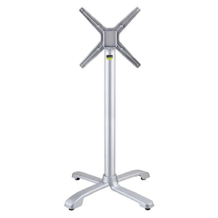 The FLAT Tech CT4335 SX26 Table Base Bar Height 26" Cross Base is engineered for versatility and stability across various dining settings, tailored to meet the specific needs of both indoor and outdoor environments. This sophisticated table base features a 26-inch cross base and a 2-5/9 inch diameter column, providing robust support for diverse dining applications. Its thoughtfully designed 15 x 15-inch flip top mounting plate allows for easy stacking, optimizing space management in dynamic venues. The base is constructed with EP coated aluminum, ensuring durability and resistance to wear in diverse conditions. Key to its appeal is the hydraulic PAD stabilization technology, which adeptly adjusts to uneven surfaces, guaranteeing a stable dining experience. This feature is particularly beneficial in high-traffic areas or establishments with varying floor conditions. The table base accommodates a maximum tabletop size of 26-inch square and 30-inch round, making it a versatile choice for varying table designs and layouts. Shipping in four boxes, it offers convenience in handling and installation. The FLAT Tech CT4335 SX26 is an ideal choice for commercial spaces looking for a blend of functionality, design flexibility, and superior stability.