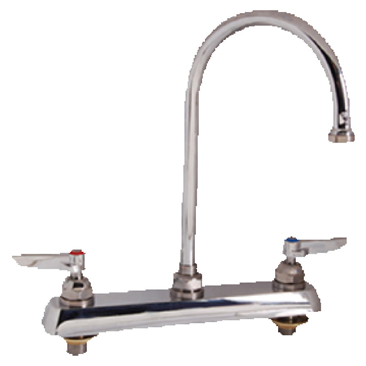 The Franklin Machine Products 110-1155 1100 Series Faucet is a premium deck mounted faucet engineered with precision for professional use. Featuring 8-inch centers, this faucet ensures a robust and steady installation on any compatible deck surface. Its elegant gooseneck design offers both style and functionality, with a practical 5-11/16 inch spread that facilitates a generous water flow area. The faucet is constructed from chrome-plated brass, balancing durability and aesthetic appeal while ensuring a lead-free water supply, which is crucial for health and safety standards in commercial environments. The 1-inch shanks are meticulously designed for secure attachment and long-lasting performance. This faucet is an ideal choice for a wide range of industries, including hospitality, culinary, and laboratory settings, where a dependable and visually appealing water fixture is essential. The Franklin Machine Products 110-1155 1100 Series Faucet stands out for its superior construction, reliable performance, and compliance with safety standards, making it a versatile and valuable addition to any professional workspace.