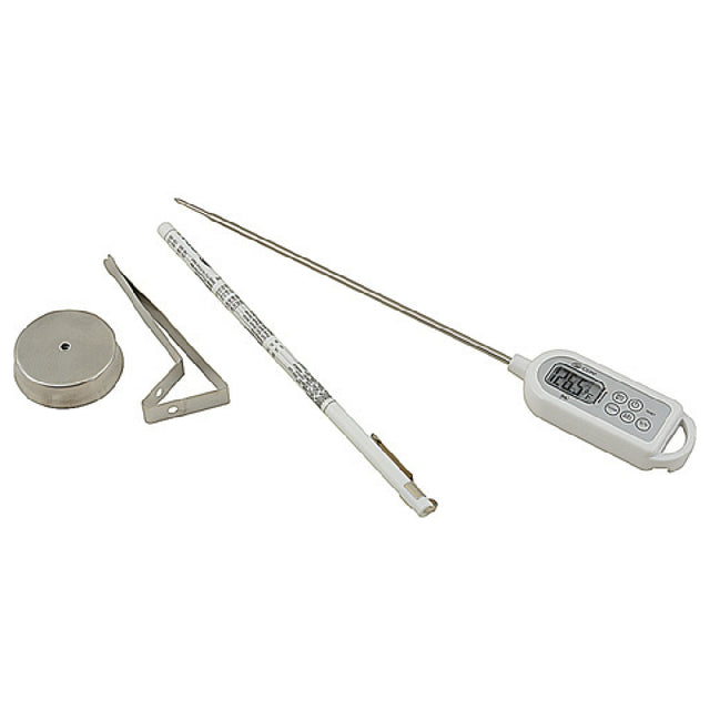 The Franklin Machine Products 138-1337 Pocket Thermometer Digital 8" Probe is an essential tool for precise temperature measurement in diverse industry segments, such as food service, catering, and laboratory settings. Designed for accuracy and convenience, this digital pocket thermometer features an extensive temperature range of -40°F to 450°F (-40°C to 232°C), making it suitable for a variety of applications. The 8-inch probe provides deep reach into foods and liquids, ensuring accurate readings even in larger volumes. This thermometer's waterproof design enhances its durability, allowing it to withstand challenging environments and making it easy to clean and maintain. NSF certification assures users of its compliance with public health and safety standards, further highlighting its reliability for professional use. Its compact size makes it highly portable, ideal for on-the-go checks or multiple station use. Whether employed in a bustling commercial kitchen, a scientific lab, or during outdoor catering events, the Franklin Machine Products 138-1337 Pocket Thermometer Digital 8" Probe delivers consistent performance and accuracy, providing professionals with a dependable tool for their temperature monitoring needs.