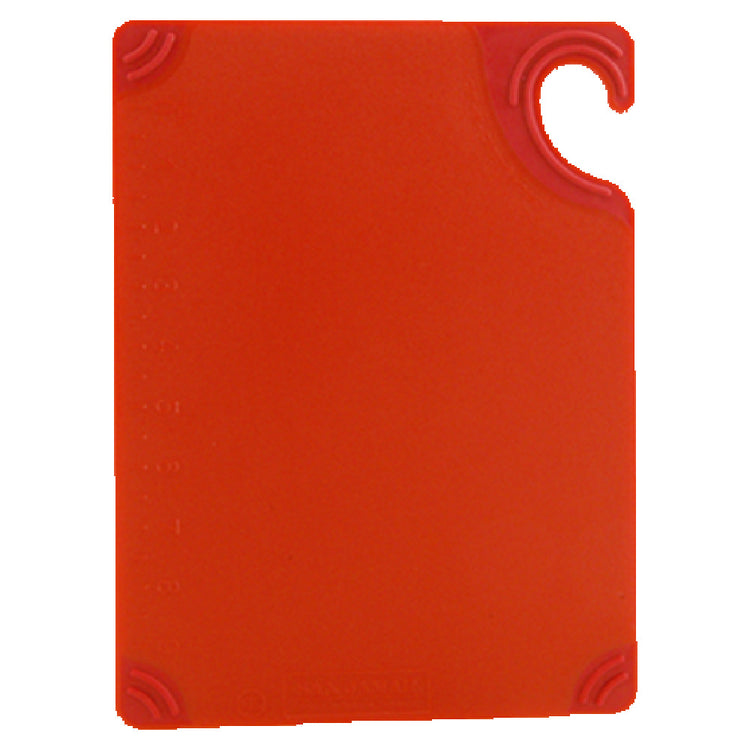 The Franklin Machine Products 150-6073 San Jamar-Saf-T-Grip Cutting Board is a precisely engineered kitchen essential designed for versatility and durability. Measuring 9 inches by 12 inches with a thickness of 3/8 inch, this cutting board is constructed from high-quality co-polymer material, ensuring a robust surface for various culinary tasks. Its vibrant red color not only adds a pop of color to any kitchen environment but also helps in color-coded food preparation, minimizing cross-contamination risks. The co-polymer construction provides a non-porous surface that resists moisture and bacteria, making it a hygienic choice for commercial kitchens. Certified by NSF, this cutting board meets rigorous public health standards, making it an excellent choice for professional chefs, catering services, and food safety-conscious home cooks. The San Jamar-Saf-T-Grip series is renowned for its slip-resistant grip, providing stability during use and enhancing safety in fast-paced kitchen environments. Designed for seamless integration into various foodservice operations, this cutting board balances functionality and safety, making it an indispensable tool for food preparation settings that demand high standards of hygiene and efficiency.