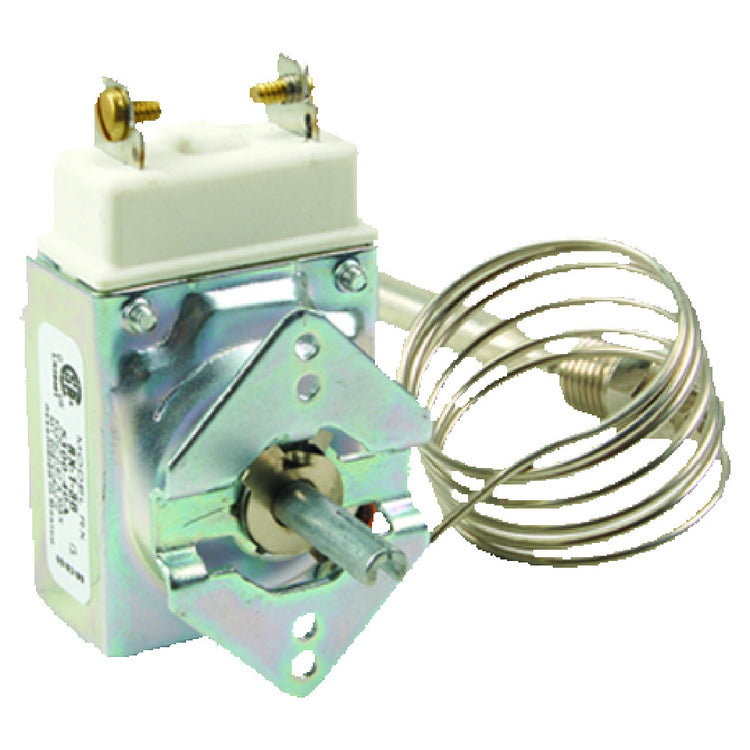 The Franklin Machine Products 196-1060 Thermostat RX-type with Dial is a precision-engineered thermostat designed for applications requiring meticulous temperature regulation. Featuring a 36-inch capillary and a 1/4-inch NPT stuffing box, it offers adaptability in various industrial settings. The thermostat operates within a temperature range of 200°F to 400°F, making it suitable for high-temperature environments. It is equipped with a 3/8-inch by 5-5/8-inch bulb and hermetically sealed reed switches, ensuring durability and reliability. The device supports a 0.67 amp capacity, highlighting its efficiency in energy consumption. This thermostat is particularly valuable for industries needing precise thermal management, such as food service equipment, heating systems, and industrial machinery. Its user-friendly dial interface allows for easy temperature adjustments, catering to both novice and experienced operators. The hermetically sealed design helps protect internal components from moisture and contaminants, enhancing longevity and performance. The Franklin Machine Products 196-1060 Thermostat RX-type with Dial represents a blend of robust construction and advanced functionality, making it an indispensable component for maintaining optimal operational conditions in demanding industrial environments.