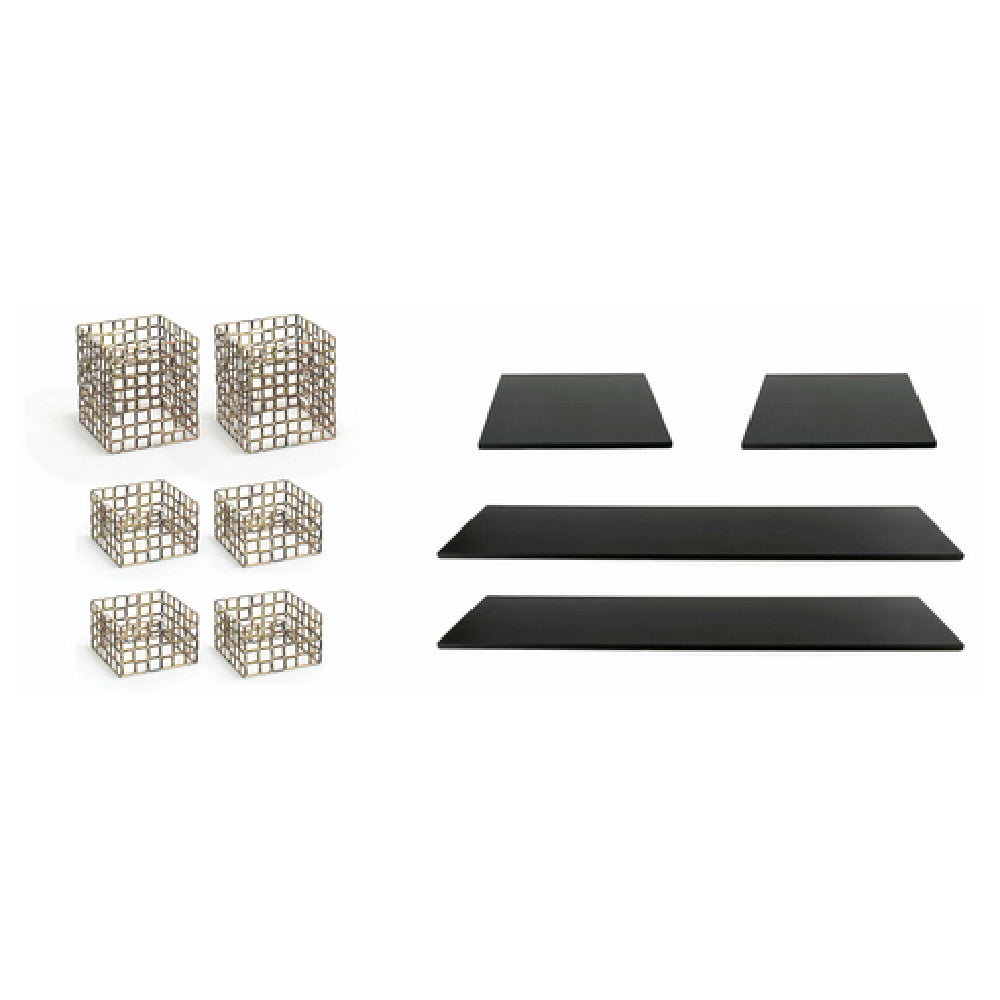 FOH®, BST047MUM28, Buffet Essentials - Coppered Link - Black Bamboo on Coppered, includes two BRI002GOI20 Coppered Link Risers - Set of 3, two BHO055BKW20 36" x 8" Bamboo Board - Black, and two BHO057BKW20 14" Square Bamboo Board - Black [Kitted] (Packed By: 1 Each)