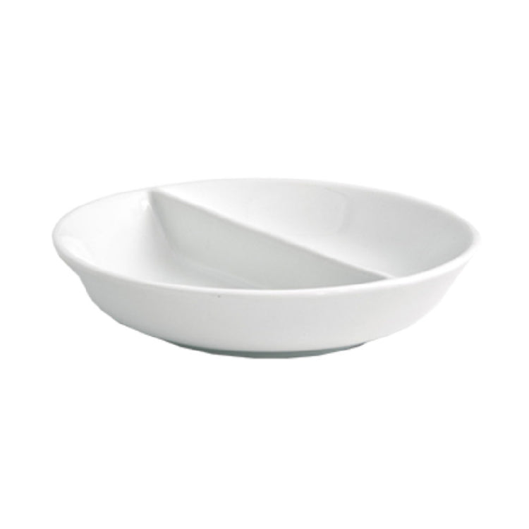 FOH®, DSD027WHP23, Promotional pricing may be available! Contact your FOH® sales representative for details! Monaco Divided Dish, 2-compartment, 2 oz. per bowl, 4-3/4" dia. x 1", round, wide rim, porcelain (Packed By: 12 Each Per Case)