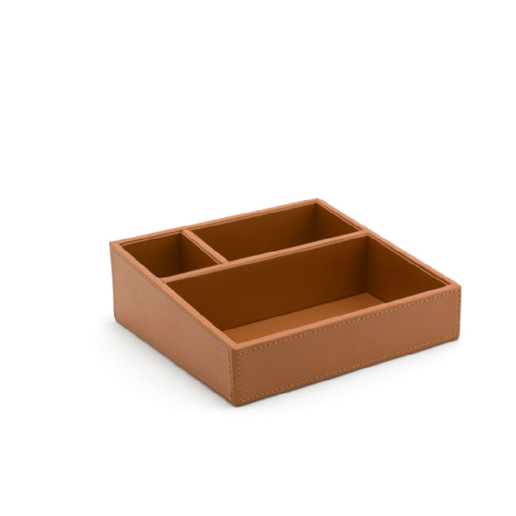 FOH®, RAH002TAL21, Promotional pricing may be available! Contact your FOH® sales representative for details! Accessory Holder, 8.25"W x 8.75"D x 3"H, Rectangular, 3-Compartment, Faux Leather, Saddle, room360® - London (Packed By: 4 Each Per Case)