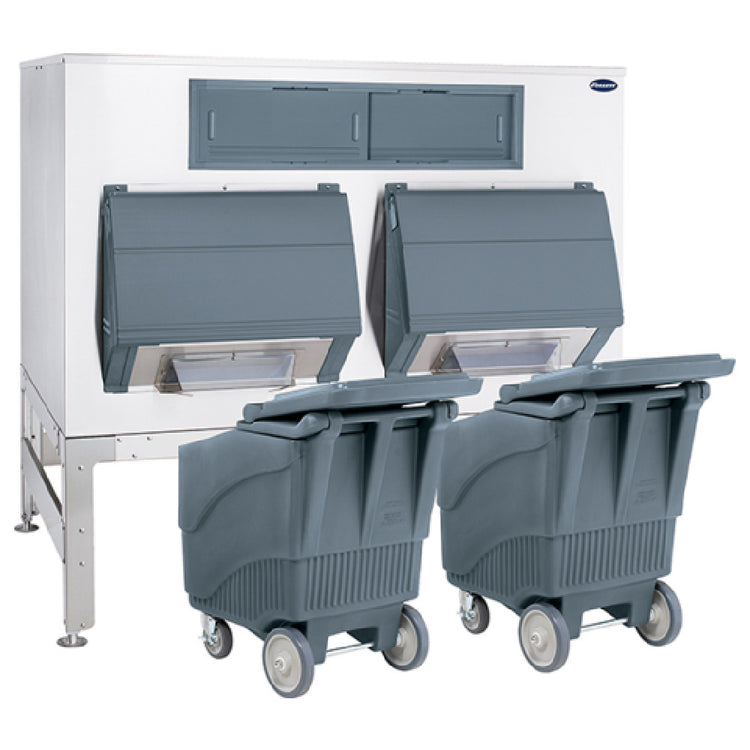 The Follett DEV2250SG-72-ICS125L Ice-DevIce™ With Cambro ICS125L Cart is engineered for high-capacity ice storage, offering a substantial 2250 lb. bin storage capacity. This product features a front chute and a durable poly liner, ensuring efficient and easy ice dispensing. The SmartGATE ice shield adds an additional layer of functionality, managing ice flow effectively. Enhanced with two poly doors equipped with the PowerHinge™ door hinge, this unit promises longevity and ease of use. The full stainless steel exterior and base, complemented by a stainless steel top custom cut for an ice machine, provide robust durability and a sleek appearance. Included with the Ice-DevIce™ are an 82 oz plastic ice scoop, paddle and rake set, facilitating simple ice handling. The package is completed with two polyethylene carts, each featuring a hinged lid and capable of holding 125 lbs of ice. Designed exclusively for cube or Chewblet ice, this unit is NSF certified, attesting to its compliance with health and safety standards. The Follett DEV2250SG-72-ICS125L is an ideal choice for industries requiring large-scale ice storage and efficient handling, providing a reliable solution tailored to meet diverse market needs within the food service and hospital sectors.