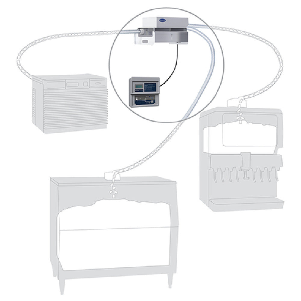 Follett IMDV-2 Ice Manager Diverter Valve System is a sophisticated solution engineered to optimize ice distribution in commercial settings. This system seamlessly integrates with the Horizon Elite™ Chewblet ice machine, directing ice to two separate dispensers or bins with precision. It features a control panel, diverter valve, and insulated transport tubing, all designed to ensure efficient and reliable operation. The inclusion of sensor cables and components necessary for connecting two ice storage units underscores its versatility in various configurations. The IMDV-2's ability to manage ice delivery automatically makes it invaluable for establishments requiring consistent ice availability across multiple points. This product is particularly beneficial for large-scale operations, including hotels, hospitals, and food service venues, where the demand for ice is high and varied. By streamlining the ice delivery process, the IMDV-2 enhances operational efficiency and reduces manual labor, making it an essential asset in environments that prioritize convenience and reliability. Its compatibility with the Follett Horizon Elite Chewblet ice machine, specifically configured for Ice Manager, highlights its role as a pivotal component in modern ice management systems. The system's advanced design and integration capabilities set it apart as a crucial tool for managing ice distribution effectively.