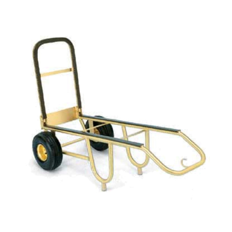 The Forbes Industries 1570-B Bellman's Handtruck is a meticulously designed transport solution featuring a 23-1/2"L fold-up dropnose, crafted from a 1" brushed brass tube, which adds a touch of elegance and durability. This handtruck's "hoop leg design" ensures stability and ease of use, making it a reliable choice for bellmen and concierge services in upscale hotels and resorts. The handtruck is equipped with brown vinyl bumper strips, which help protect walls and doorways from scratches and damage during transport. Its 10" diameter black pneumatic wheels are designed to provide smooth and effortless movement, whether navigating through hotel corridors or over uneven surfaces. The unique combination of high-quality materials and thoughtful engineering distinguishes the Forbes Industries 1570-B Handtruck as an essential tool for efficient luggage management in hospitality settings, offering practical benefits for both bellmen and guests. Its fold-up dropnose feature adds versatility, allowing it to accommodate various luggage sizes and shapes, enhancing its functionality across different operational needs. This product’s refined aesthetics, coupled with its robust construction, cater to establishments that prioritize both style and practicality in their service equipment, ensuring a seamless integration into any luxury hotel's operational workflow.