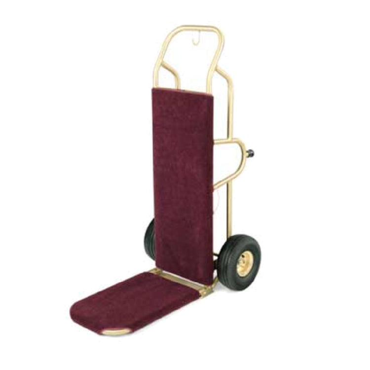 The Forbes Industries 1570-CK-SS Bellman's Handtruck is a versatile piece of equipment designed for efficiency and durability. With a 23-1/2" fold-up dropnose, this handtruck effortlessly accommodates different sizes and types of luggage, making it ideal for high-traffic environments like hotels and conference centers. Its construction features a 1" brushed stainless steel tube, providing both strength and resistance to corrosion. The handtruck’s unique hoop leg design adds stability and support, ensuring that even heavy loads are transported with ease. Additionally, it includes a wrap-around carpet kit to protect items from scratches and scuffs during transit. The 10" diameter black pneumatic wheels, accompanied by chrome-plated hubs, allow for smooth and quiet movement across various surfaces, enhancing its usability in diverse settings. This carefully engineered handtruck caters to the needs of hospitality professionals seeking reliability and efficiency in their operations.