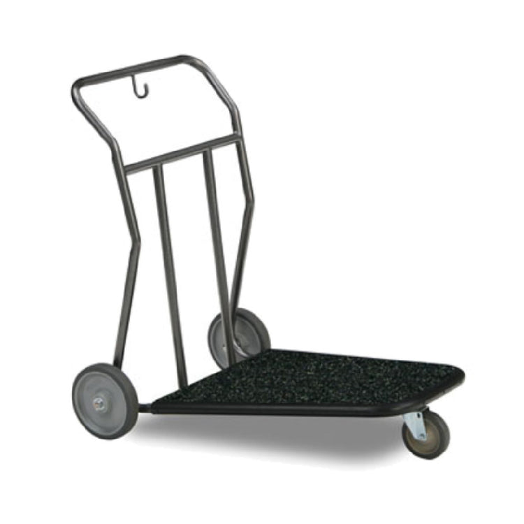 The Forbes Industries 1575 Luggage Cart Self-serve 28"W X 37"D X 37"H is engineered for efficient luggage handling in diverse environments such as hotels, resorts, and airports. This luggage cart features a one-piece steel round tube frame, ensuring durability and strength. It comes equipped with two vertical retainers that aid in securely holding luggage in place. Additionally, the utility hook adds functionality for hanging small items or bags. The steel deck, complemented by a rubberized mat, provides a sturdy and slip-resistant surface for luggage placement. Measuring 28 inches in width, 37 inches in depth, and 37 inches in height, the cart offers ample space while maintaining a compact profile for easy maneuverability. The jumbo vinyl bumper protects walls and furniture from accidental bumps during transit. Mobility is enhanced by its wheel configuration - two 8-inch wheels at the back provide stability and support, while a 5-inch grey swivel wheel at the front allows for smooth directional changes. The powder-epoxy finish enhances the cart's resistance to wear and corrosion, ensuring a long-lasting, aesthetically pleasing appearance. This combination of thoughtful design and practical features makes the Forbes Industries 1575 Luggage Cart a reliable asset across various professional settings requiring frequent luggage transport.