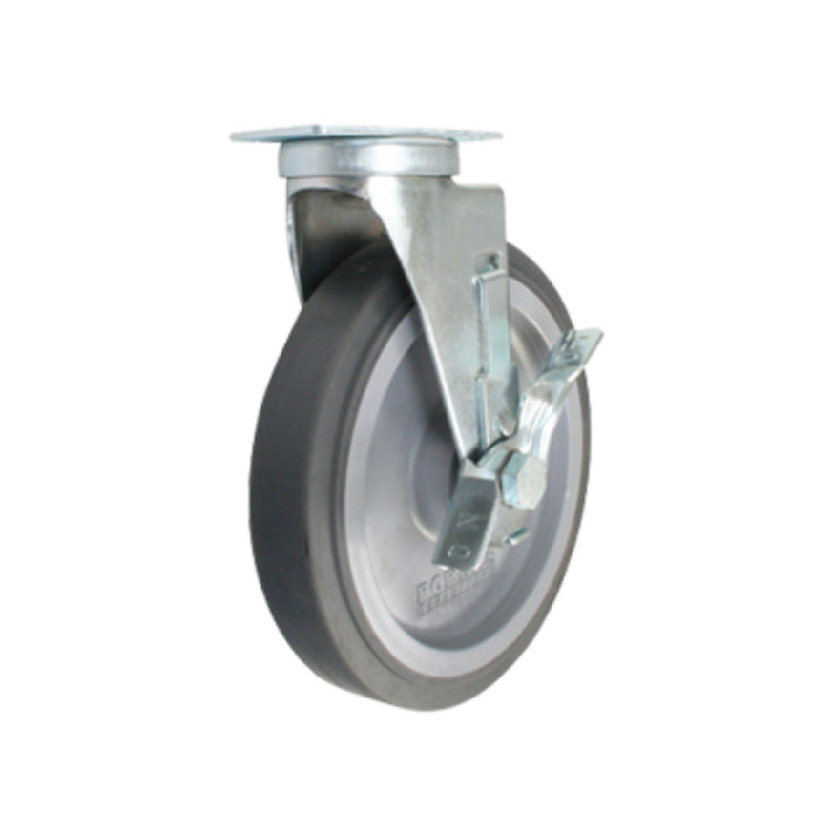 The Forbes Industries 1634-S/BK Replacement Caster is a specialized component featuring an 8-inch diameter solid gray non-marking wheel, designed to meet the diverse needs of industries requiring seamless mobility and surface preservation. This caster is zinc-plated, ensuring enhanced durability and corrosion resistance, which is particularly beneficial in environments exposed to moisture or chemicals. The swivel design of the caster allows for 360-degree mobility, making it ideal for maneuvering carts or equipment in tight or crowded spaces. Additionally, the inclusion of a brake provides added safety and stability during stationary periods, a critical feature for industries such as hospitality, healthcare, and manufacturing, where precision and safety are paramount. The non-marking wheel is especially advantageous in maintaining the aesthetic integrity of floor surfaces, making it suitable for use in hotels, conference centers, and other settings where floor appearance is crucial. The Forbes Industries 1634-S/BK Replacement Caster exemplifies a combination of functionality and reliability, catering to varying operational needs across different sectors. Its robust construction and thoughtful design make it a valuable asset for maintaining efficiency and cleanliness in professional environments.