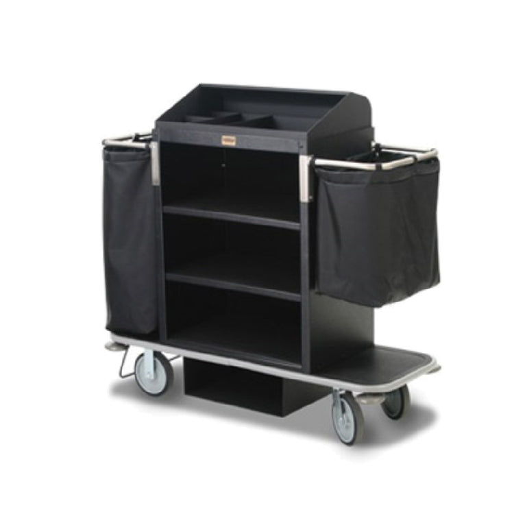The Forbes Industries 2220 Plastic Housekeeping Cart is engineered for efficiency and functionality with its three spacious shelves housed within a 30" W x 19" D x 36" H cabinet. This cart exemplifies practicality in housekeeping tasks, featuring a top tray organizer complemented by a partial curved privacy panel. Its low-profile Stainless Steel handles ensure ease of maneuverability, making it a reliable tool in various professional settings. The cart's under-deck glass rack holder is designed to optimize storage space, while the full wrap-around vinyl bumper and four revolving corner bumpers provide enhanced protection against potential impacts. This versatile cart includes a vacuum bracket equipped with a bungee cord, securing the vacuum handle for added convenience. It rolls smoothly on 8" black wheels, ensuring effortless transport across diverse floor surfaces. Ideal for hospitality environments, the Forbes Industries 2220 cart is a robust solution that accommodates the intricate requirements of housekeeping staff, combining durability with thoughtful design features. Its comprehensive build and efficient storage capabilities make it a valuable asset for maintaining cleanliness and organization within hotels, resorts, and other facilities that prioritize high standards of service.
