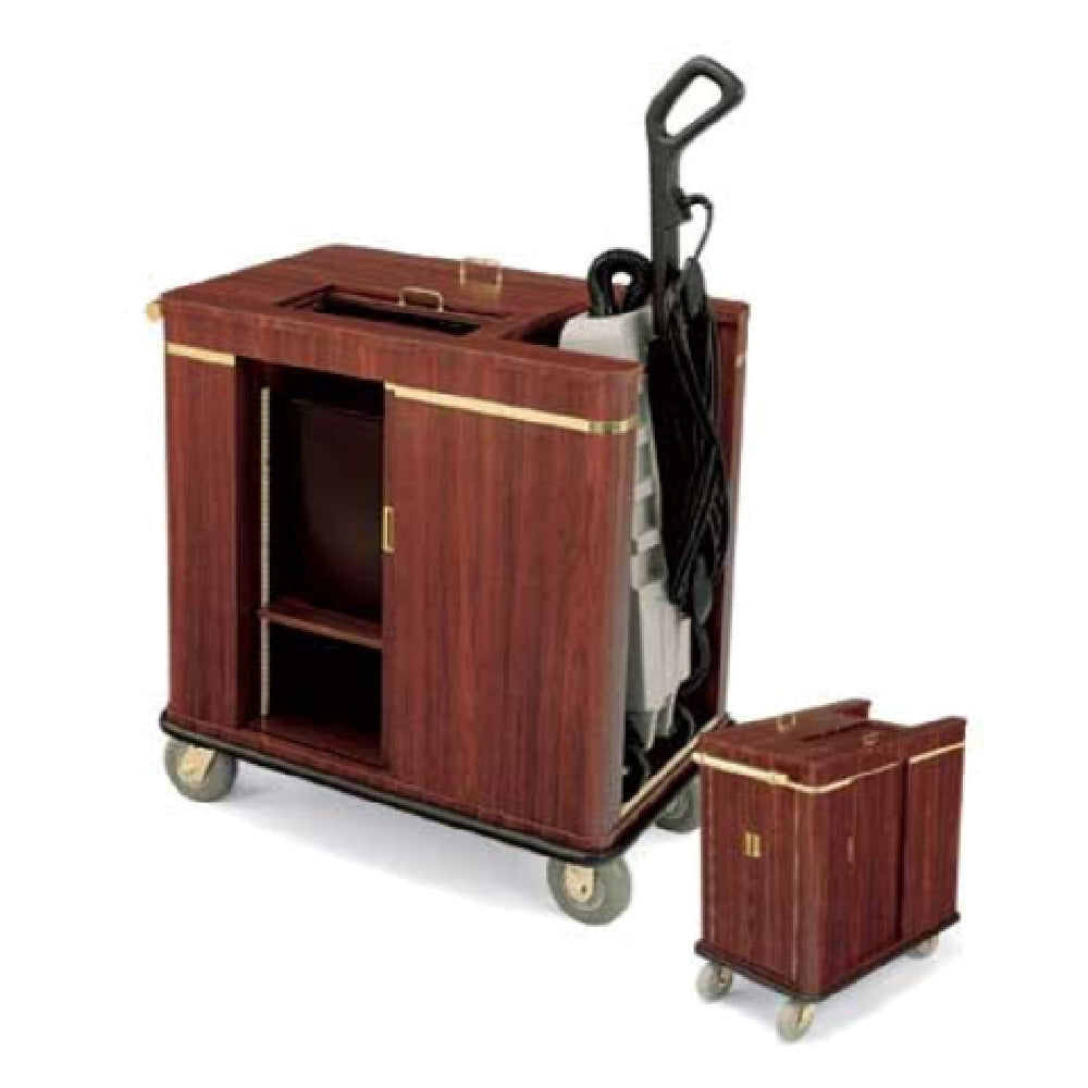 The Forbes Industries 2238 Guest Room Attendant Cart is a versatile, furniture-style cart with a sophisticated high-pressure laminate finish. It features a main cabinet equipped with a single adjustable shelf designed to accommodate a small plastic trash can, which is included with the cart. The cart's functionality is enhanced by a sliding door and dual sliding lids, offering easy access and efficient organization. The enclosed end of the cart includes two shelves and two doors, providing ample storage space for various supplies. Meanwhile, the open end is specifically designed to hold an upright vacuum, adding to its utility in maintaining cleanliness in guest rooms. A solid brass handle ensures durability and ease of maneuverability. The cart is equipped with a full wrap-around vinyl bumper to protect both the cart and the surrounding environment from damage during use. Brass-plated casters and 6-inch diameter grey cushion wheels facilitate smooth and silent movement across different surfaces, making it suitable for hotels and hospitality services. This cart combines functionality with elegance, making it a valuable asset for maintaining impeccable guest room service standards.