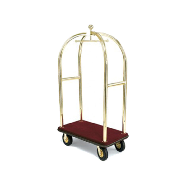 The Forbes Industries 2421 Birdcage® Luggage Cart is a meticulously engineered solution for the hospitality sector, standing out with its 2-inch diameter tubular superstructure crafted from polished brass. This sturdy framework ensures durability and elegance, making it ideal for luxury hotels and resorts aiming to deliver an exceptional guest experience. The cart is equipped with two 2-inch diameter push bars, providing ease of maneuverability for staff across different floor types. The cart features a carpeted deck, adding a touch of sophistication while protecting luggage from scuffs and scratches. A full wrap-around bumper safeguards both the cart and surrounding surfaces from potential damage, enhancing the longevity and appearance of the equipment. Additionally, the cart rolls smoothly on 8-inch diameter black pneumatic wheels housed in brass-plated hubs and forks, ensuring a quiet and efficient transport experience. This ingenious design caters to upscale establishments that value both functionality and aesthetics, ensuring that guests' first impressions are marked by seamless service and attention to detail. Whether in bustling hotel lobbies or serene resort retreats, the Forbes Industries 2421 Birdcage® Luggage Cart stands as a testament to quality and efficiency in guest service operations.