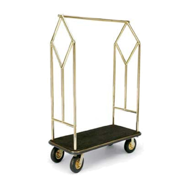 The Forbes Industries 2444 Specialty Luggage Cart stands out with its 1-1/4" diameter tubular superstructure, designed for durability and elegance. Crafted from solid brass, this cart is both robust and visually appealing, making it a perfect fit for luxury hotels and resorts that prioritize both functionality and aesthetics. Its carpeted deck provides a secure and gentle surface for transporting luggage, reducing the risk of damage to bags. The full wrap-around bumper ensures protection for both the cart and the surrounding environment, minimizing wear and tear on walls and furniture in high-traffic areas. Equipped with 8" diameter black pneumatic wheels housed in brass-plated hubs and forks, this luggage cart offers smooth mobility and reliable performance on various surfaces. The Forbes Industries 2444 is tailored for markets that demand a combination of sturdy construction and elegant design, catering to establishments that value the seamless integration of practicality and style in their everyday operations.