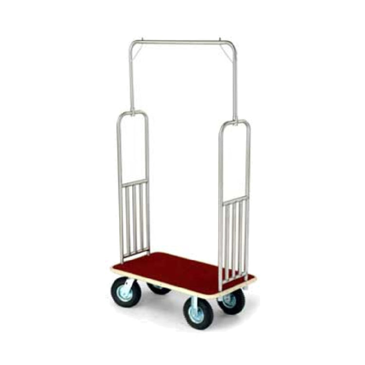 Forbes Industries 2487 Specialty Luggage Cart is designed for optimal functionality in high-traffic environments such as hotels, resorts, and conference centers. This luggage cart features a sturdy 1-inch diameter tubular superstructure, ensuring durability and support for heavy loads. Its carpeted deck provides a non-slip surface to protect luggage during transport. The brushed stainless steel construction not only enhances its aesthetic appeal but also offers resistance to corrosion, making it ideal for frequent use. The cart is equipped with extra vertical retaining bars, which help secure luggage in place, minimizing the risk of items falling during transit. A full wrap-around bumper is incorporated to protect both the cart and surrounding fixtures from damage. The cart features 8-inch diameter black pneumatic wheels mounted on zinc-plated casters, facilitating smooth and controlled maneuverability across various surfaces. This model, which replaces the 2486, is designed to meet the needs of hospitality professionals seeking a reliable and efficient luggage transportation solution. Its thoughtful design and robust construction make it a valuable asset in any setting where both functionality and appearance are of paramount importance.