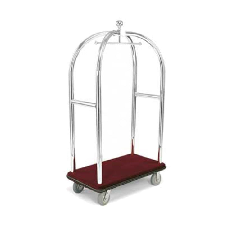 The Forbes Industries 2517-DT Birdcage® Luggage Cart is an exemplary piece of equipment tailored for high-demand environments such as hotels and resorts. This cart is distinguished by its 2" diameter tubular superstructure, ensuring robust strength and durability. It features a carpeted deck that provides a soft and protective surface for luggage, safeguarding against scratches and damage. The cart is equipped with two 2" diameter push bars, facilitating easy maneuverability and control for users. A full wrap-around bumper is integrated into the design, offering added protection against impacts and preserving the cart’s aesthetic appeal. Mobility is further enhanced with 6" diameter grey cushion non-marking wheels, housed in chrome-plated caster forks, which allow for smooth and silent transportation without leaving marks on floors. This luggage cart embodies a blend of functional efficiency and elegant design, catering to the needs of hospitality industry professionals looking to enhance guest experience and operational efficiency. Its thoughtful construction and premium materials make it a durable and reliable choice for transporting luggage within luxury settings.